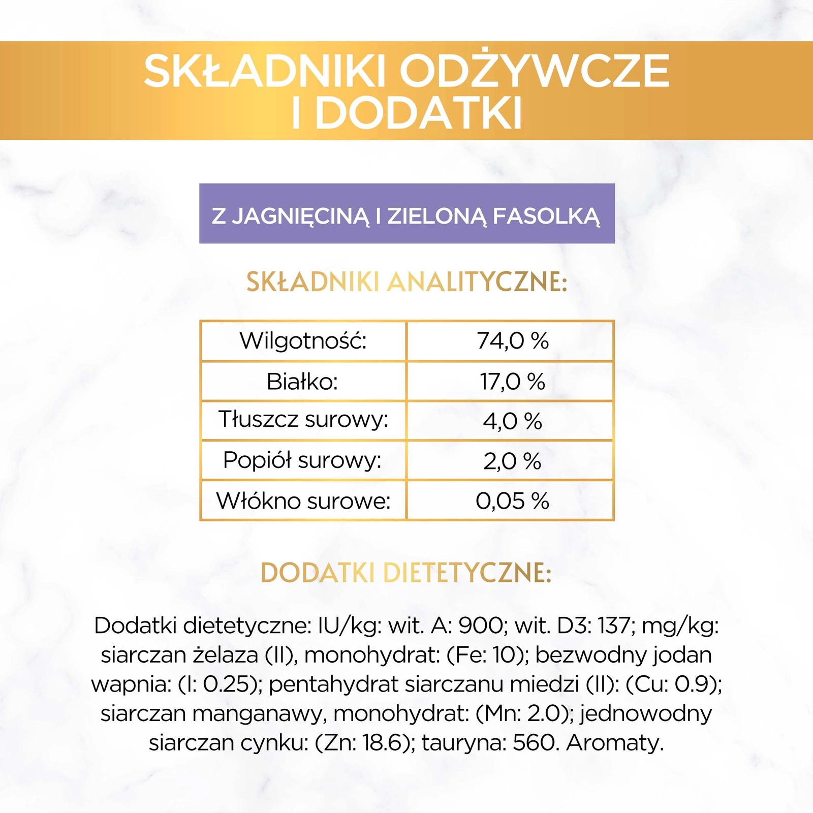 Skład: Mięso i produkty pochodzenia zwierzęcego (w tym jagnięcina 4%), roślinne ekstrakty białkowe, ryby i produkty rybne, składniki pochodzenia roślinnego, warzywa (0,8% suszonej zielonej fasoli, co odpowiada 7,2% zielonej fasoli), składniki mineralne, cukry.