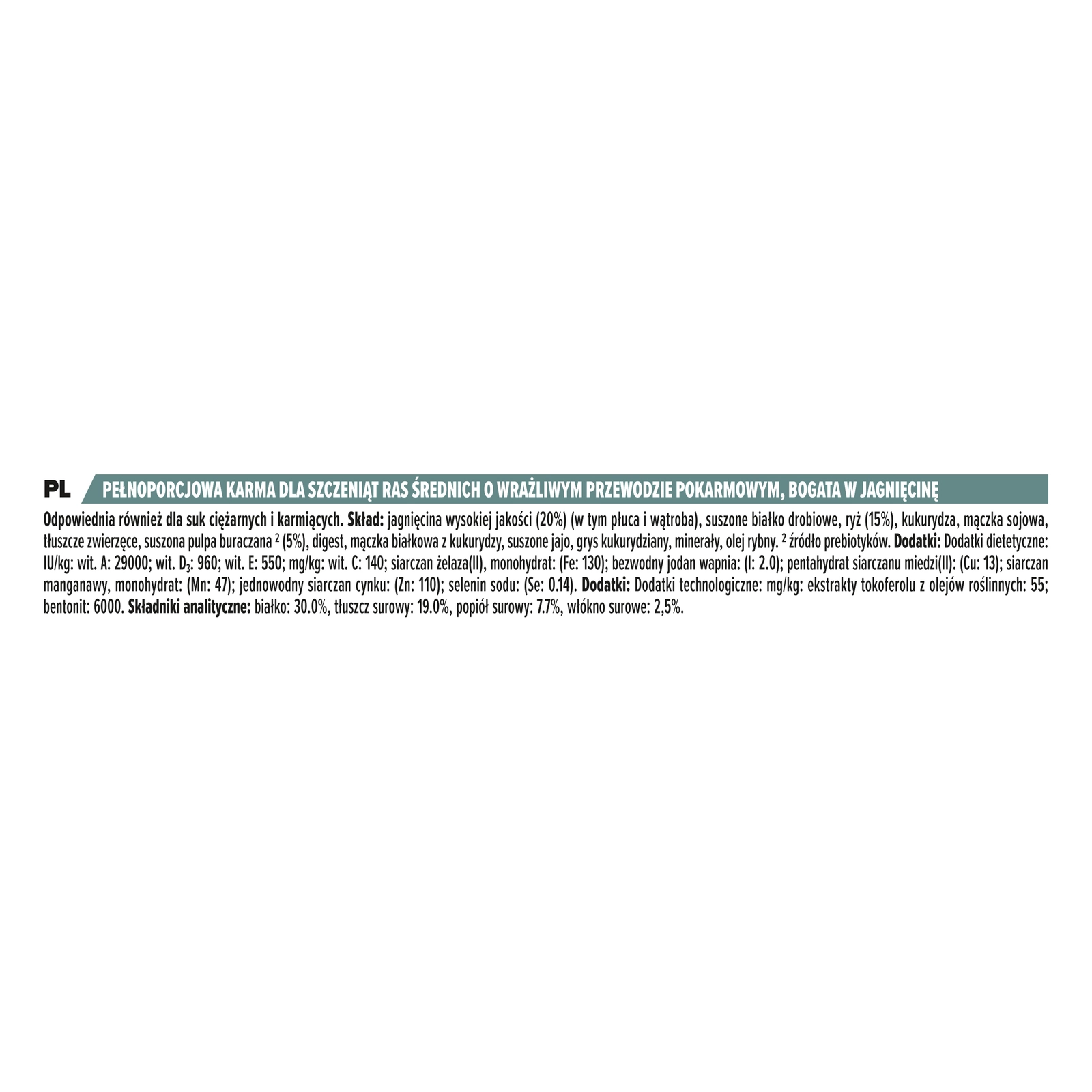 Karma Purina Pro Plan Medium Puppy Sensitive Digestion to pełnoporcjowa sucha karma dla szczeniąt średniej wielkości z wrażliwym przewodem pokarmowym. Dzięki unikalnej formule OPTIDIGEST, wspiera prawidłowe funkcjonowanie układu pokarmowego Twojego pupila. Zawiera starannie dobrane składniki odżywcze, które przyczyniają się do długotrwałego zdrowia szczeniąt oraz suk ciężarnych i karmiących. Karma o smaku jagnięciny z ryżem zaspokaja potrzeby żywieniowe młodych psów.