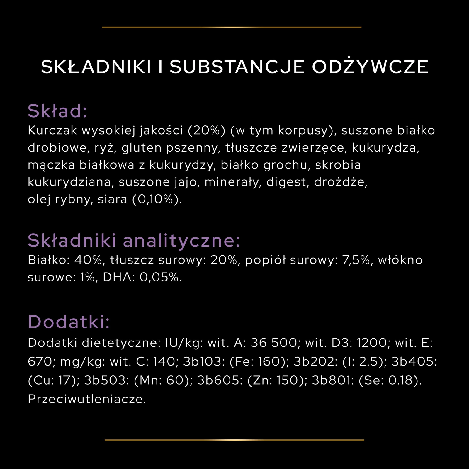 Karma zawiera naturalne składniki, takie jak siara, witamina E oraz kwasy tłuszczowe Omega 3 i 6, które wspierają zdrowie kociąt. Dzięki DHA, ważnemu dla rozwoju mózgu i wzroku, oraz wysokiej zawartości białka i kalorii, karma sprzyja zdrowemu wzrostowi. Małe i łatwe do żucia krokiety sprawiają, że kocięta chętnie sięgają po tę karmę. Pro Plan to doskonały wybór dla Twojego pupila, zapewniając mu wszelkie niezbędne składniki do prawidłowego rozwoju.