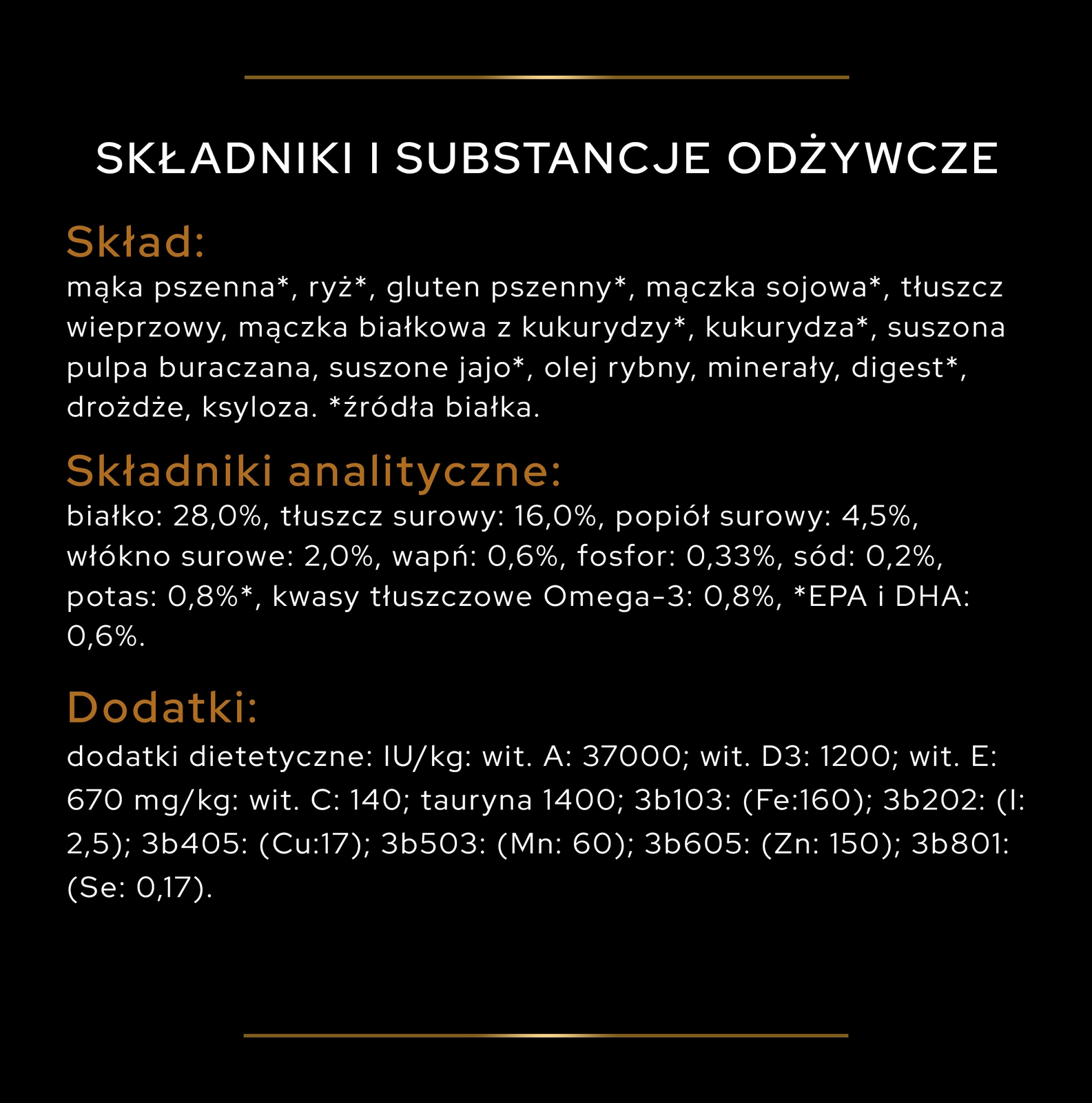Składniki: Karma zawiera kukurydzę, ryż, mączkę sojową, mąkę pszenną oraz odwodnione białko drobiowe. Dodatkowo, w składzie znajdują się również olej rybi, suszone jajo, a także składniki mineralne.