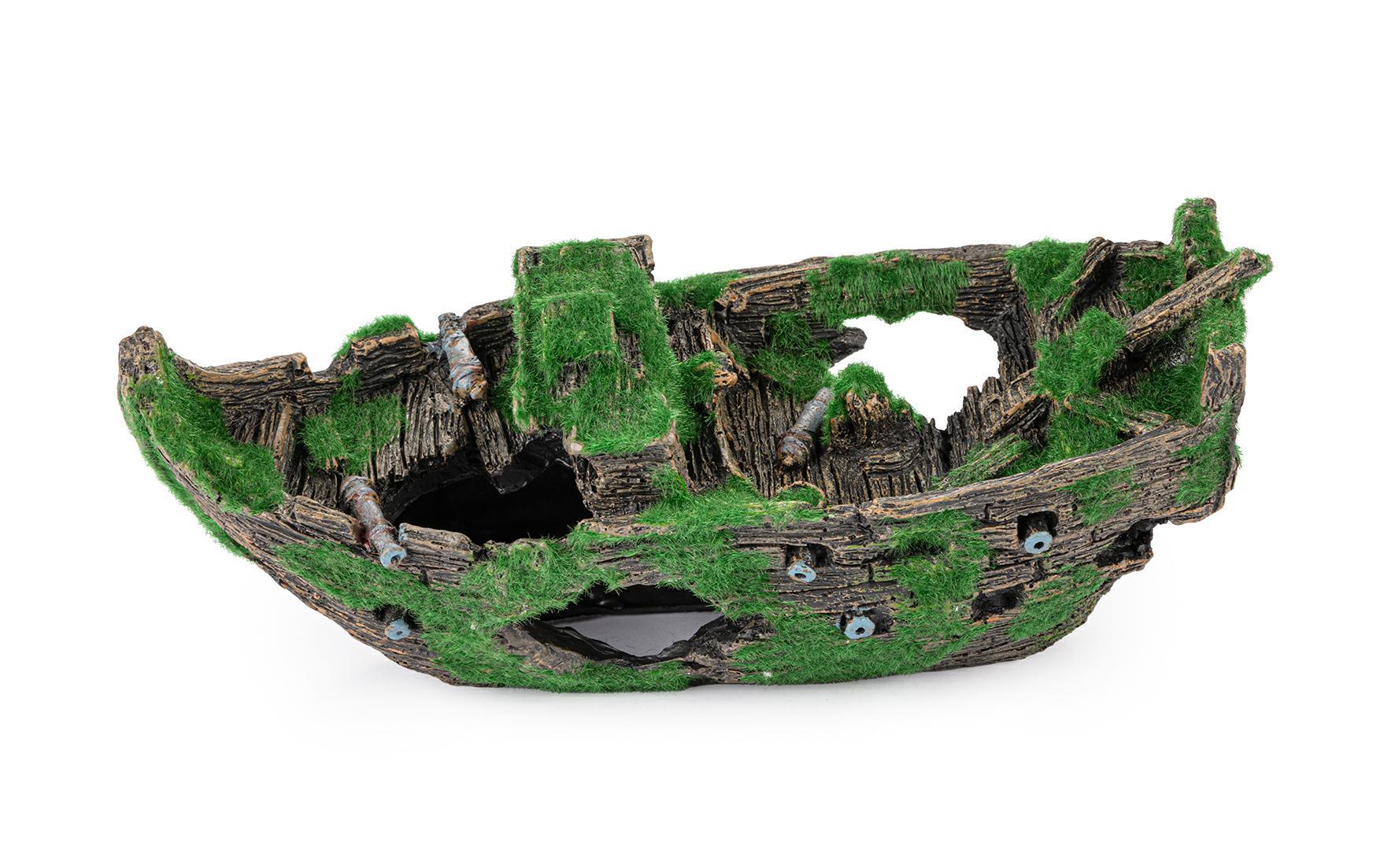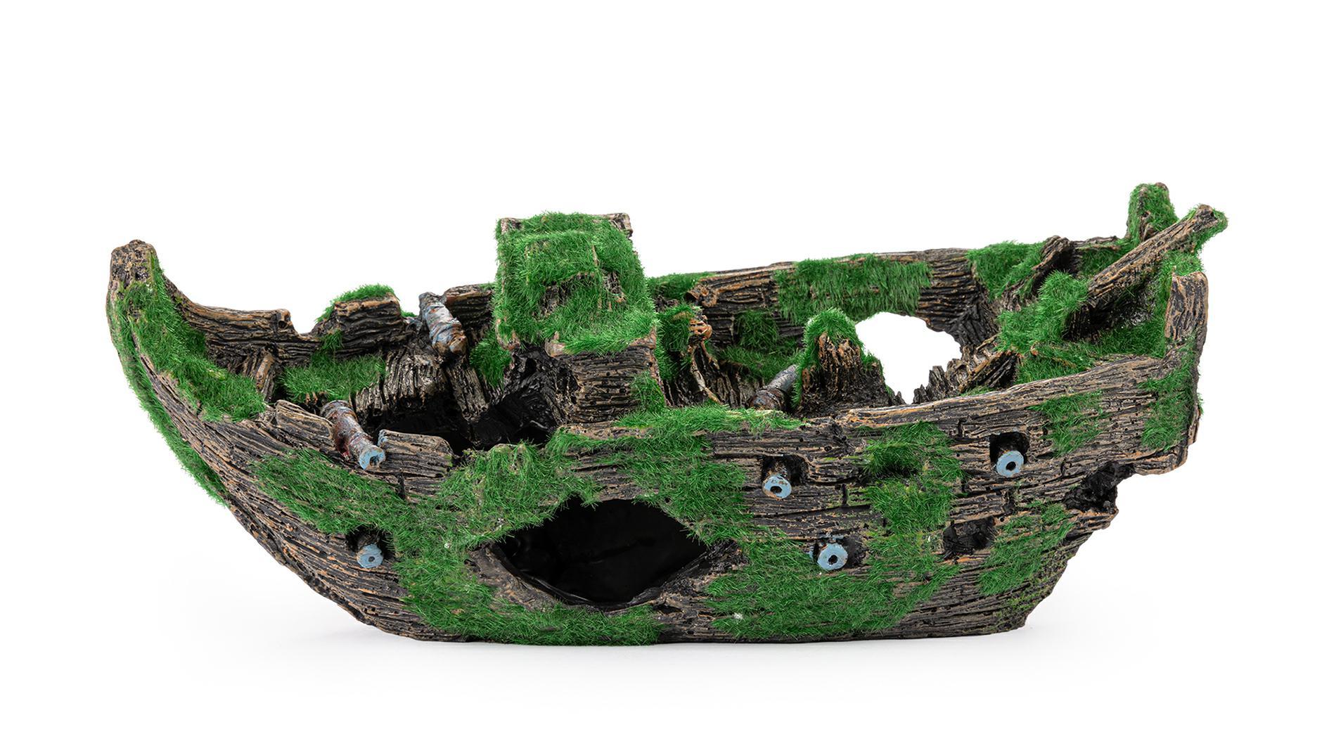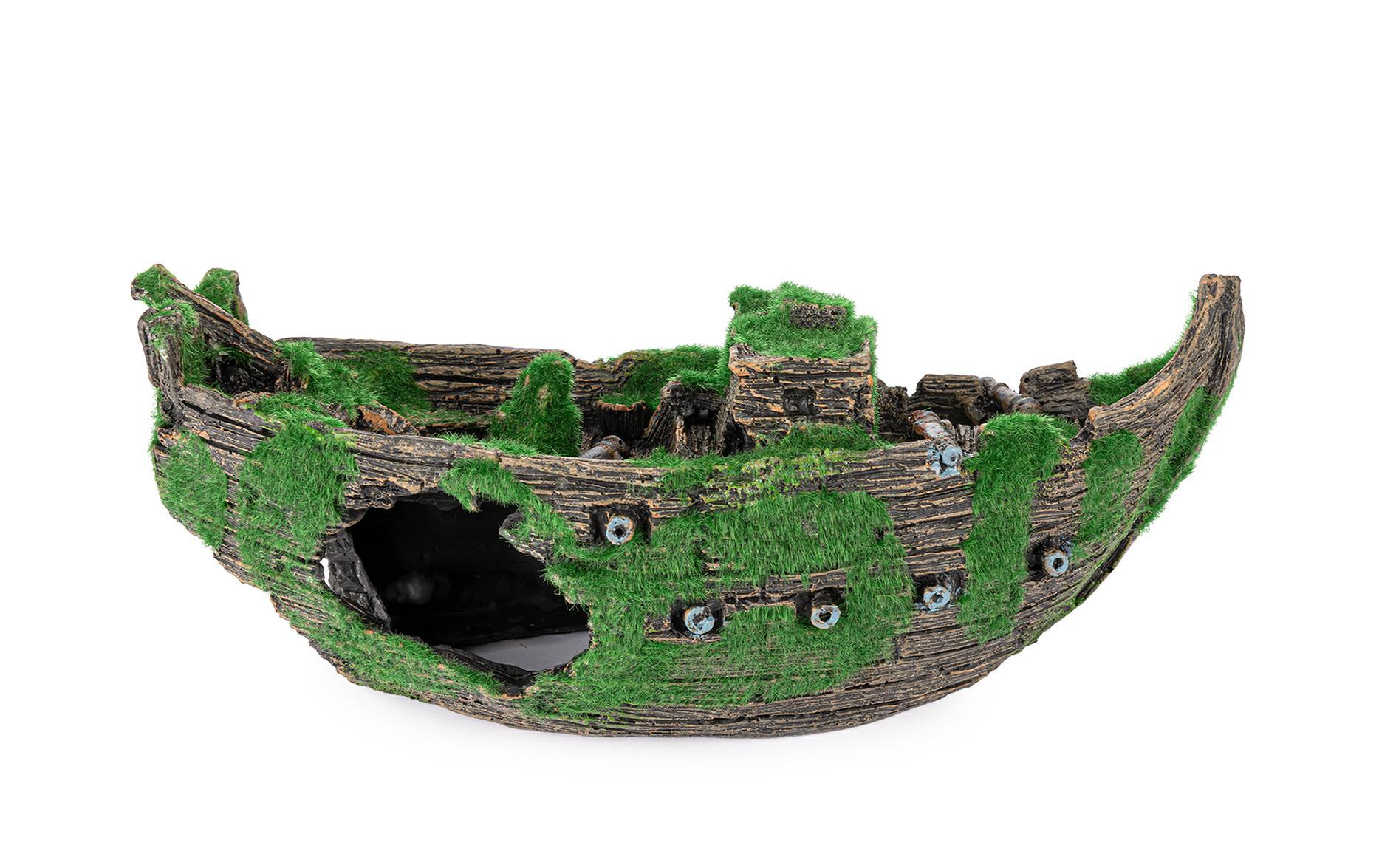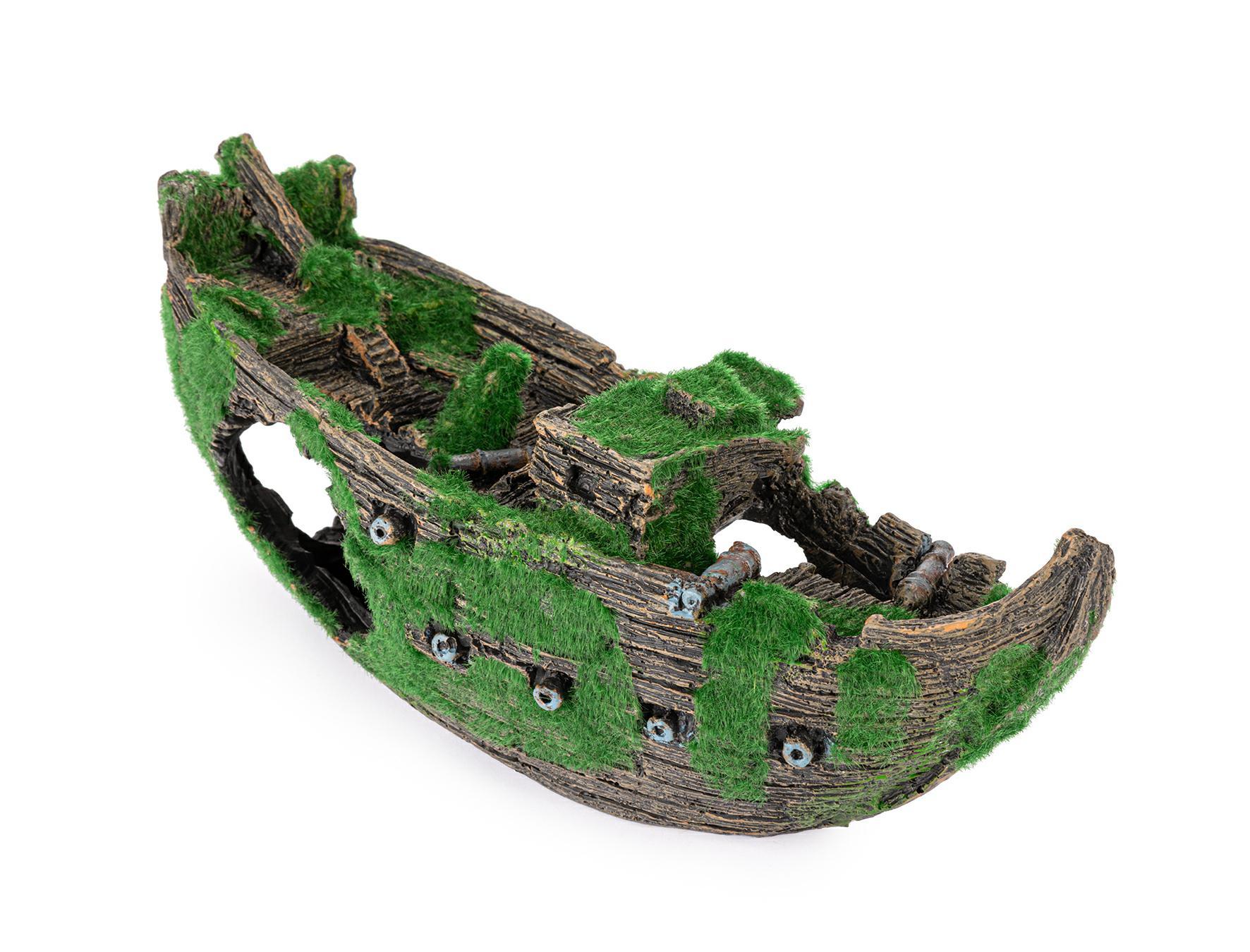 Statek pokryty jest sztucznym mchem, co nadaje mu naturalny wygląd. Wykonana z poliestru, ozdoba jest bezpieczna dla ryb i innych organizmów wodnych. Dzięki swojemu odpowiedniemu ciężarowi, statek łatwo tonie w wodzie, co ułatwia jego umiejscowienie w akwarium.