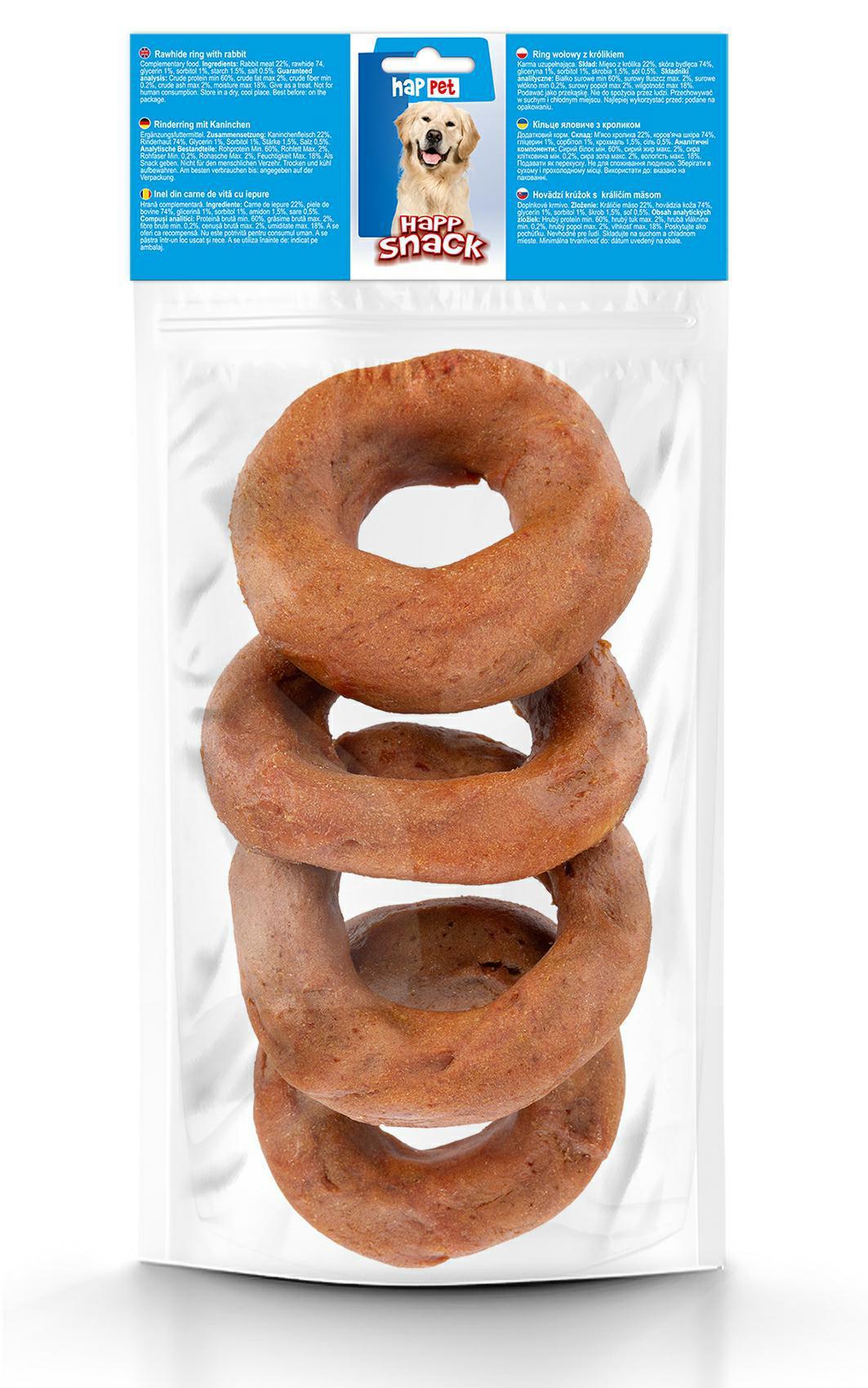 Smaczna przekąska dla dużych i średnich psów. Białe, prasowane krążki ze skóry wołowej owinięte mięsem z królika.