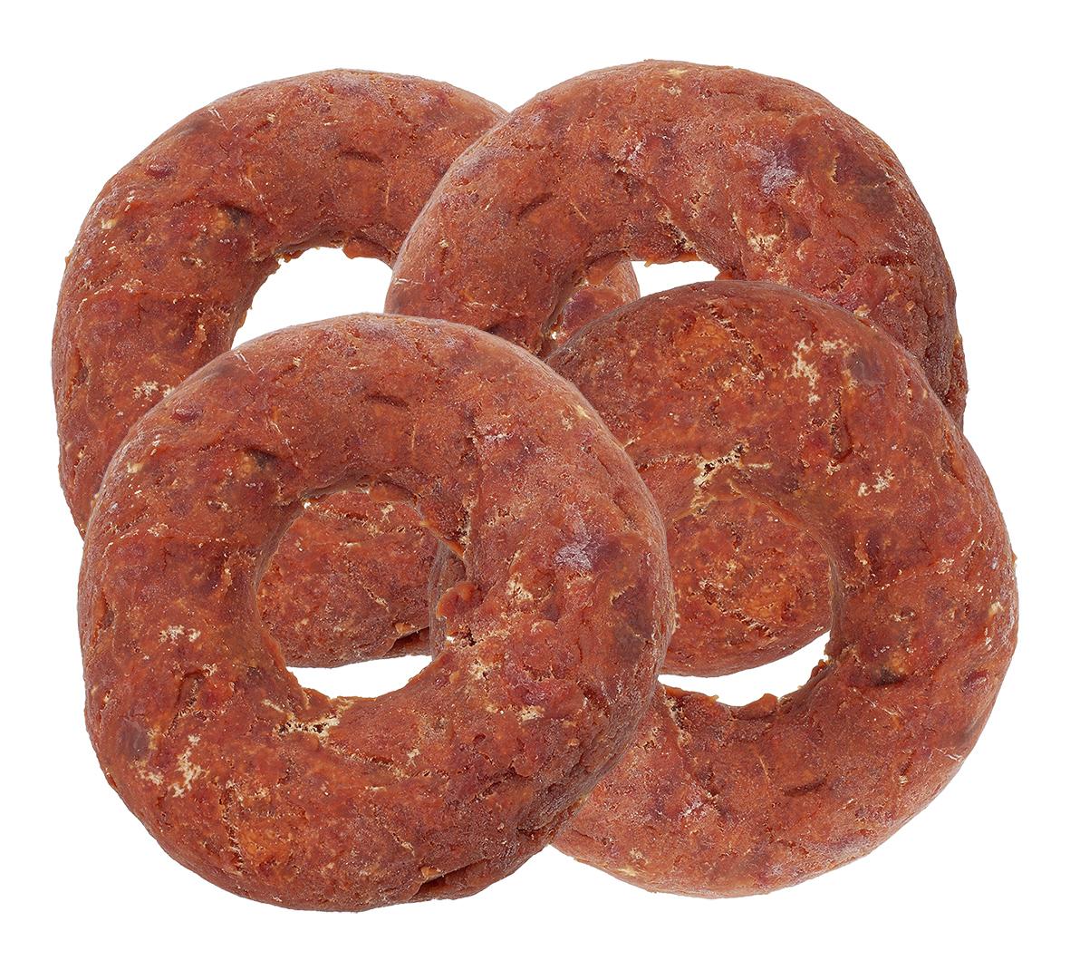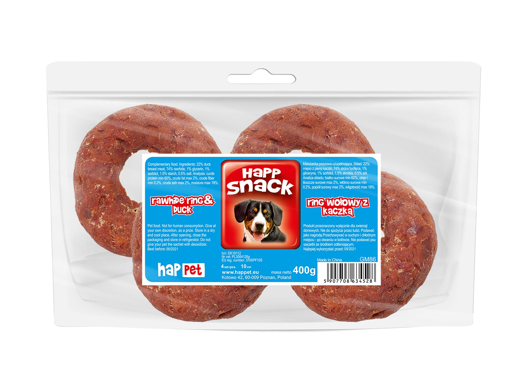 Smaczna i zdrowa przekąska dla dużych i średnich psów. Ring wołowy z kaczką to doskonałe połączenie dużych krążków ze skóry wołowej, owiniętych mięsem z piersi kaczki. To pyszny przysmak, który dostarcza psom długotrwałej rozrywki i zaspokaja ich naturalną potrzebę gryzienia.