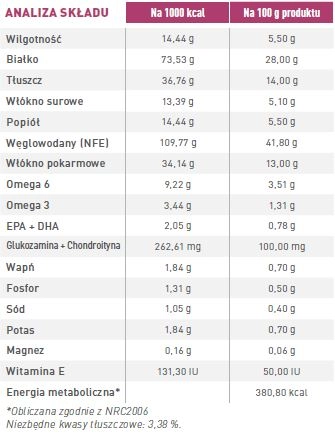 Analiza składu: Wilgotność: 9,50 g, Białko: 22,5 g, Tłuszcz: 16 g, Włókno surowe: 1,5 g, Popiół: 5,1 g, Węglowodany: 45,40 g. Zawiera także kwasy tłuszczowe Omega 6 i Omega 3 oraz minerały, takie jak wapń i fosfor.