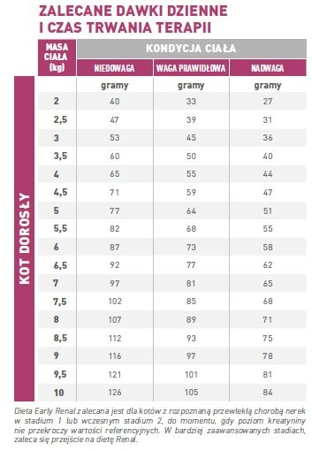 Dawkowanie: Karma jest dostosowana do wagi kota. Na przykład, kot o wadze 5 kg powinien otrzymać 64 g karmy dziennie w przypadku prawidłowej wagi.
