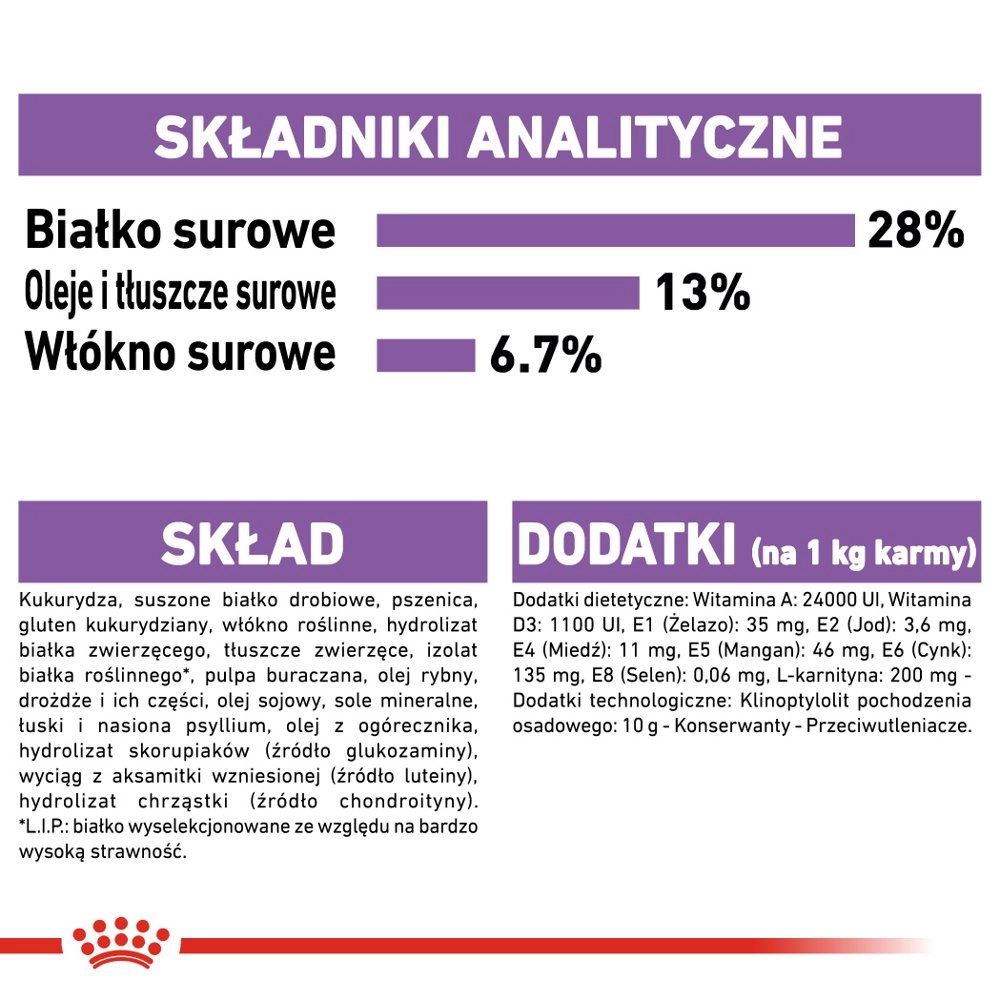 Karma zawiera zróżnicowane składniki, takie jak kukurydza, białko drobiowe, pszenica oraz włókna roślinne, które wspierają prawidłowe funkcjonowanie układu pokarmowego. Dodatkowo, zawiera l-karnitynę oraz składniki wspierające stawy.