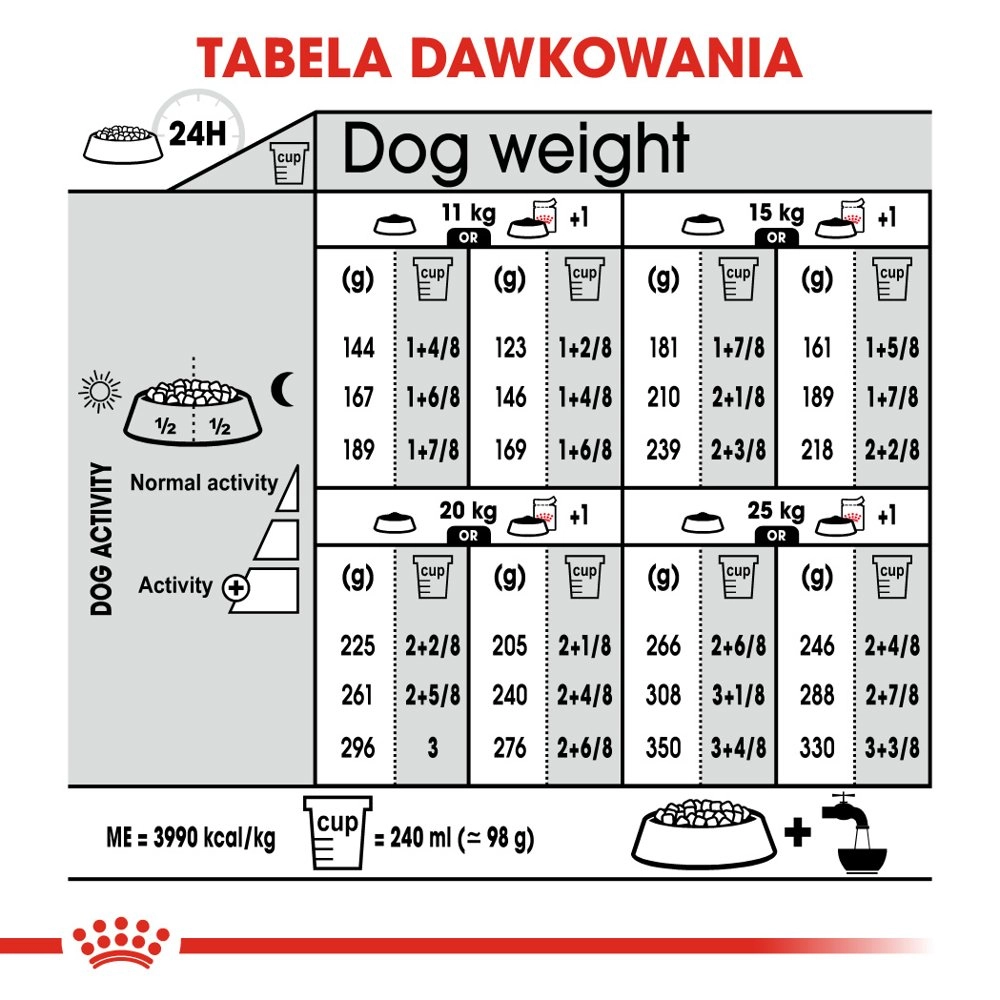 Dawkowanie: Karma powinna być podawana w zależności od wagi psa oraz jego aktywności. Dla psa o wadze 26 kg i normalnej aktywności należy podać 326 g karmy dziennie.