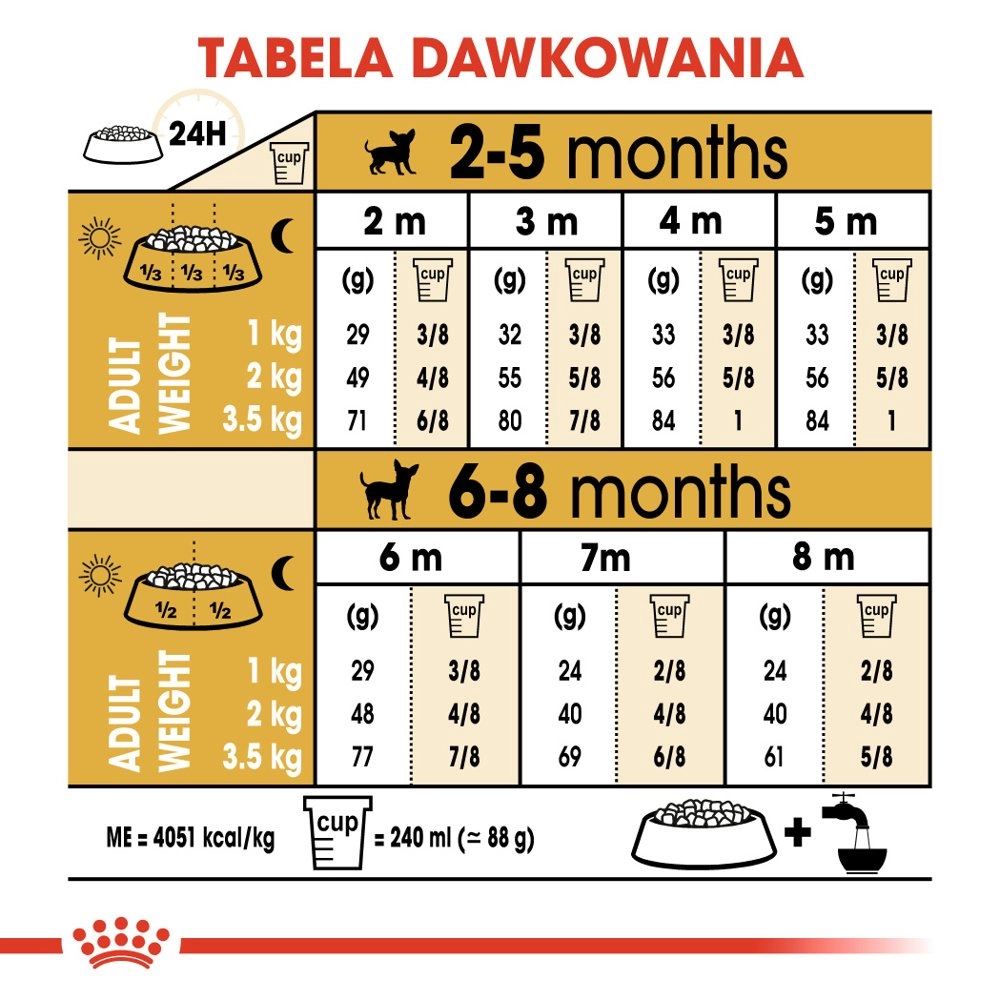 Karma ROYAL CANIN Chihuahua Puppy jest przeznaczona dla szczeniąt rasy chihuahua do 8 miesiąca życia. W tym kluczowym okresie wzrostu, pies poznaje nowe otoczenie oraz domowników, a jego układ immunologiczny rozwija się. Karma wspiera zdrowie układu pokarmowego, co przyczynia się do zmniejszenia objętości oraz neutralizacji nieprzyjemnego zapachu odchodów.
