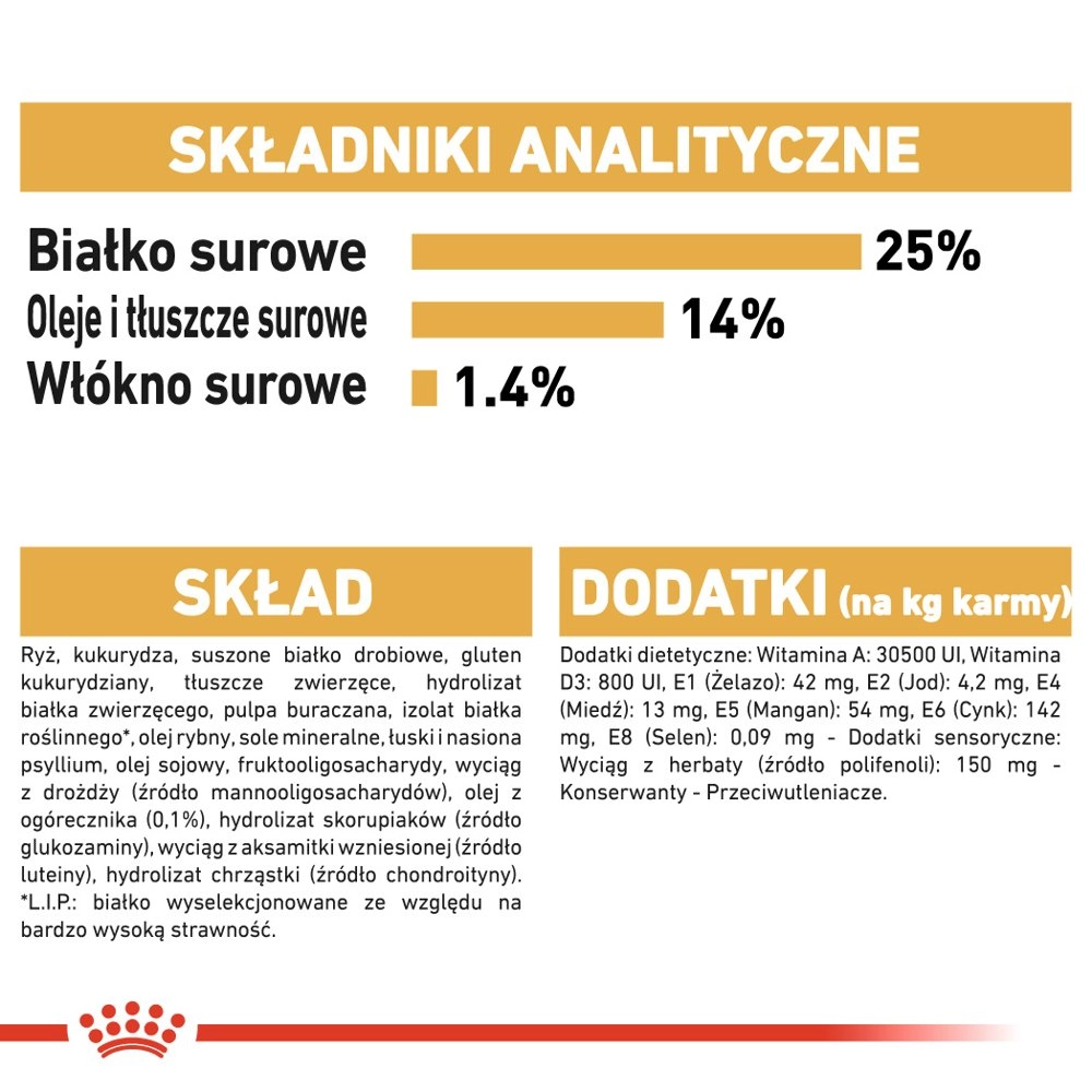 Karma ROYAL CANIN Cocker Adult zawiera odpowiedni poziom tłuszczu, co sprzyja utrzymaniu idealnej wagi. Wspiera prawidłowe funkcjonowanie mięśnia sercowego, a także zapobiega osadzaniu się kamienia nazębnego dzięki unikalnym składnikom wiążącym wapń. Dodatkowo, olej z ogórecznika oraz kwasy tłuszczowe omega-3 (EPA i DHA) wspomagają zdrową skórę i sierść. Dzięki tym właściwościom, karma ta jest idealnym rozwiązaniem dla psów rasy cocker spaniel.