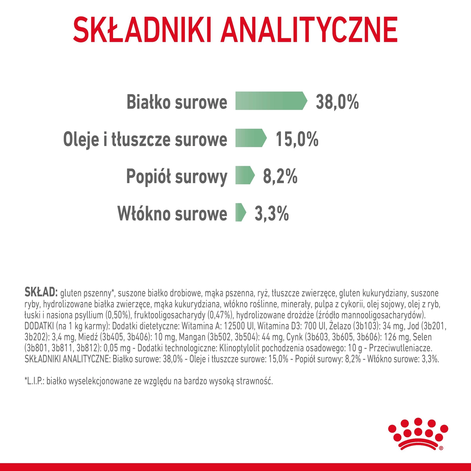 Skład: gluten pszenny, pszenica, mączka rybna, ryż, tłuszcz zwierzęcy (kurczak, kaczka, wieprzowina), hydrolizowane białka zwierzęce, gluten kukurydziany, odwodnione białko drobiowe, kukurydza, sproszkowana celuloza, pulpa z cykorii, minerały, olej sojowy, olej rybny, fruktooligosacharydy, łuski i nasiona psyllium.