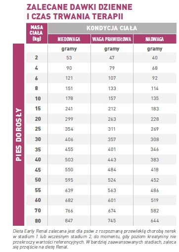 Dawkowanie: Dawkowanie karmy powinno być dostosowane do masy ciała psa. Przykładowo, pies o wadze 10 kg powinien otrzymywać od 157 do 178 gramów karmy dziennie, w zależności od jego kondycji.