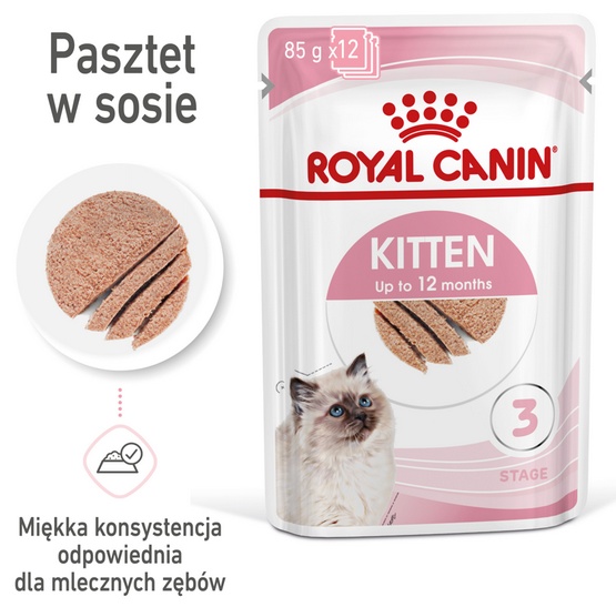Pełnoporcjowa karma dla kociąt w drugim etapie wzrostu, do 12 miesiąca życia. Dzięki wysokiej smakowitości, kocięta instynktownie wybierają tę karmę. Małe kawałki mięsa w galaretce, odpowiednie proporcje składników pokarmowych oraz specjalna receptura zaspokajają wysokie wymagania żywieniowe kotek w ciąży.