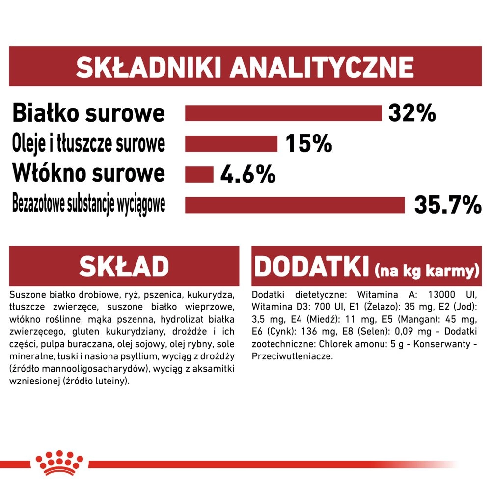 Składniki analityczne: Białko surowe: 32%, Oleje i tłuszcze surowe: 15%, Popiół surowy: 7,2%, Włókno surowe: 4,6%.