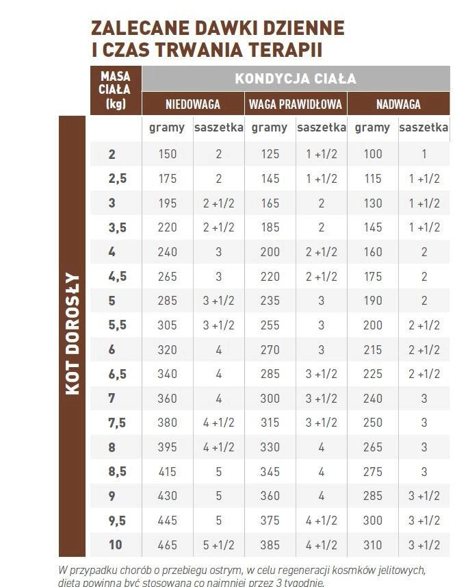 Dawkowanie: Karma powinna być podawana w odpowiednich ilościach, dostosowanych do masy ciała kota. Na przykład, dla kota o masie 4 kg zaleca się 240 g karmy dziennie.