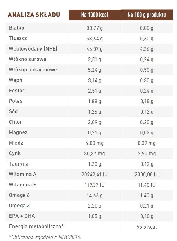 Skład: Mięso oraz produkty pochodzenia zwierzęcego, zboża, oleje i tłuszcze, sole mineralne, produkty pochodzenia roślinnego, cukry, drożdże.