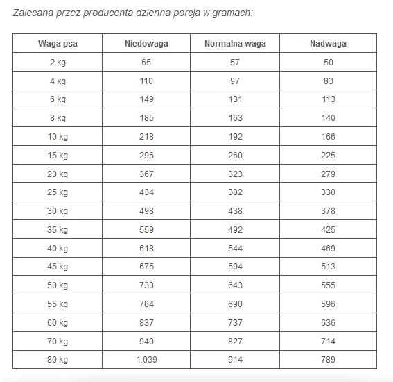 Odpowiednia ilość karmy zależy od masy ciała psa. Producent nie podaje ograniczeń wagowych zwierzęcia.
