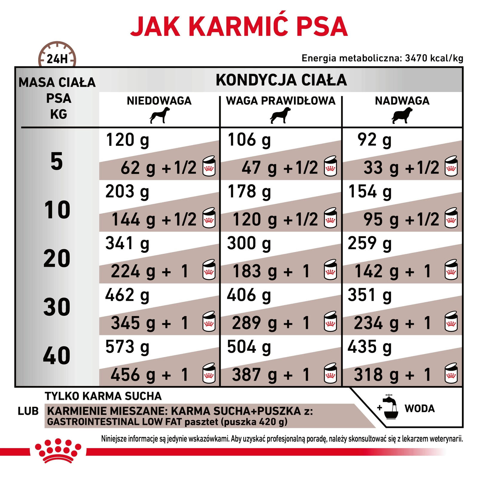 ROYAL CANIN Gastrointestinal Low Fat 12kg to pełnoporcjowa, dietetyczna karma dla dorosłych psów, stworzona z myślą o regulacji metabolizmu tłuszczów, szczególnie w przypadku hiperlipidemii. Dzięki niskiej zawartości tłuszczu oraz wysokiemu poziomowi niezbędnych kwasów tłuszczowych, wspiera zdrowie Twojego pupila.