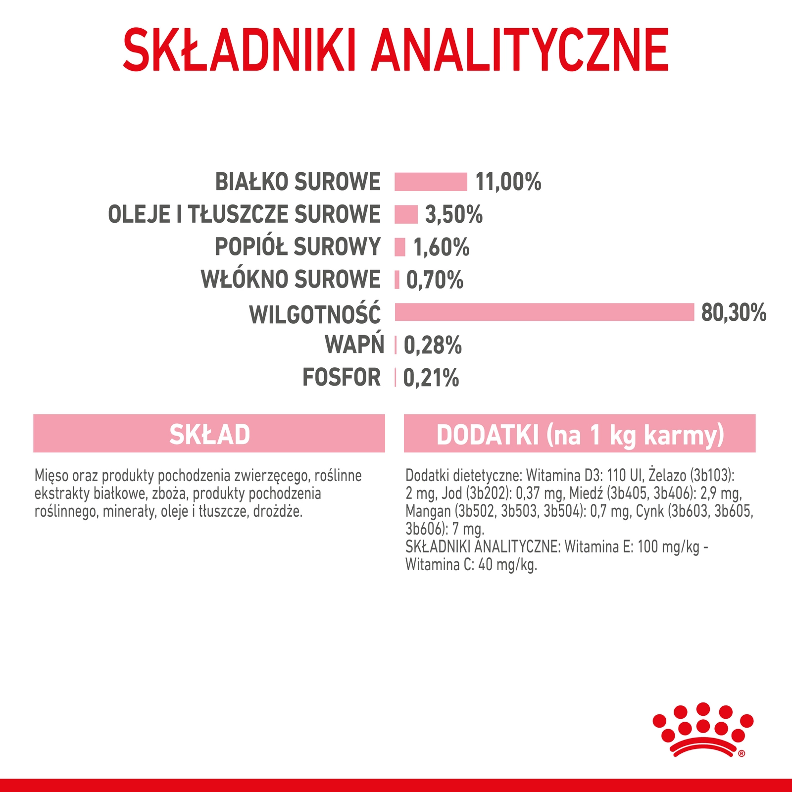 Analiza składu: Białko: 11,0%, Zawartość tłuszczu: 3,4%, Popiół surowy: 1,5%, Włókna surowe: 1,2%, Wilgotność: 80,5%.