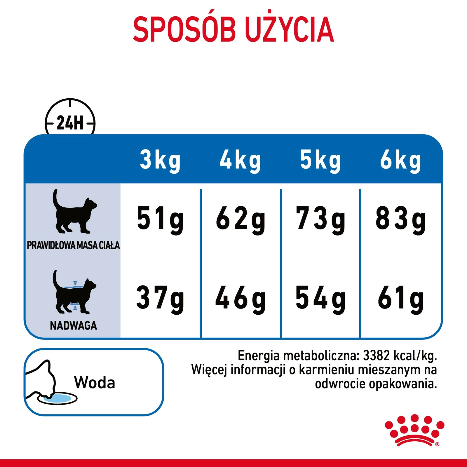 Dawkowanie: W zależności od wagi kota, zalecane dzienne ilości karmy wynoszą od 37 g do 83 g.