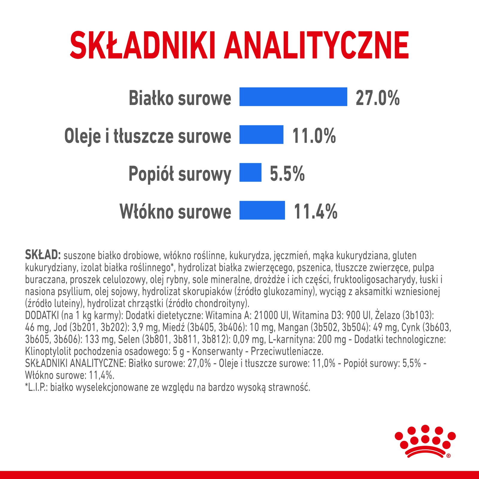 Skład: suszone białko drobiowe, włókno roślinne, kukurydza, jęczmień, mąka kukurydziana, gluten kukurydziany, izolat białka roślinnego, hydrolizat białka zwierzęcego, pszenica, tłuszcze zwierzęce, pulpa buraczana, proszek celulozowy, olej rybny, sole mineralne, drożdże, fruktooligosacharydy, łuski i nasiona psyllium, olej sojowy, hydrolizat skorupiaków, wyciąg z aksamitki wzniesionej, hydrolizat chrząstki. Zawiera dodatki dietetyczne, takie jak witaminy i minerały, w tym L-karnitynę i przeciwutleniacze.