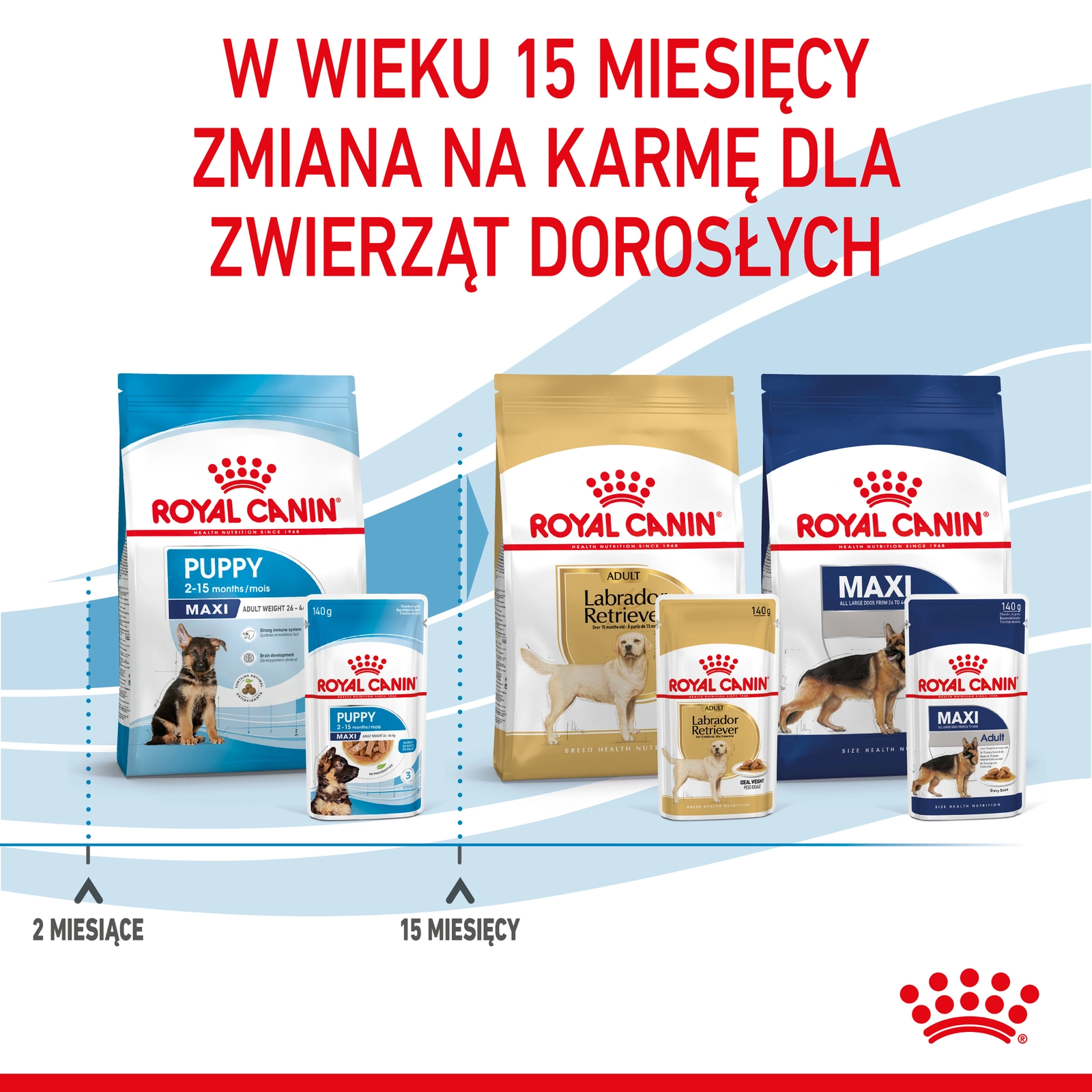 Zapewnij swojemu szczeniakowi idealny start w życie z mokrą karmą od Royal Canin. Ta pożywna karma w kawałkach mięsa w sosie jest stworzona specjalnie dla dorastających psów dużych ras, ważących od 26 do 44 kg, do 15 miesiąca życia. Dzięki starannie dobranym składnikom, karma wspiera rozwój i witalność Twojego pupila.