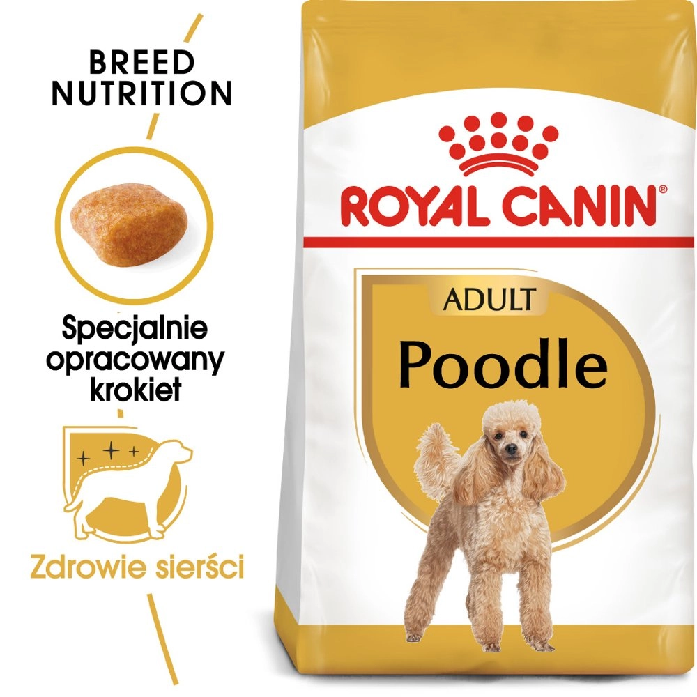 ROYAL CANIN Poodle Adult 1,5kg to karma stworzona z myślą o dorosłych psach rasy pudel. Oferuje odpowiednie składniki, które zaspokajają ich specyficzne potrzeby żywieniowe. Dzięki unikalnej recepturze, karma wspomaga zdrowie sierści oraz utrzymuje prawidłowe napięcie mięśni.
