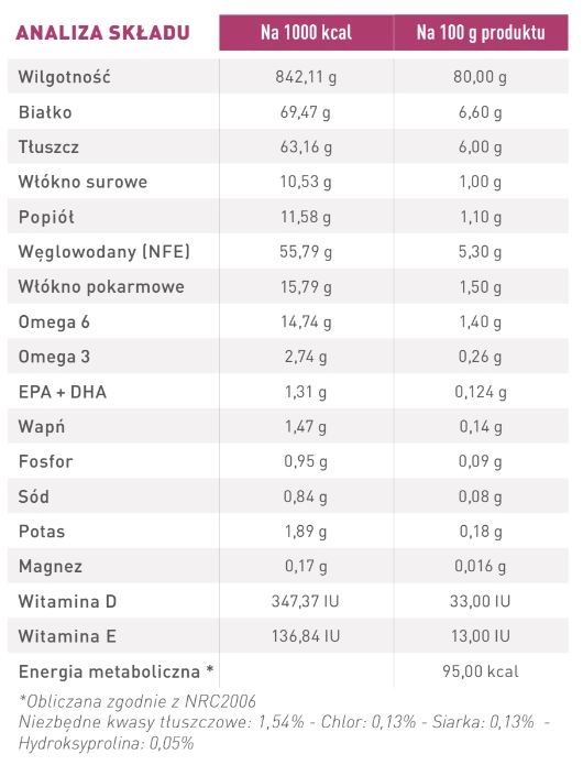 Skład: karma zawiera m.in. produkty pochodzenia drobiowego, łososia (4%), olej rybny oraz fruktooligosacharydy. Wysoka zawartość wody (80%) zapewnia odpowiednie nawodnienie zwierzęcia.