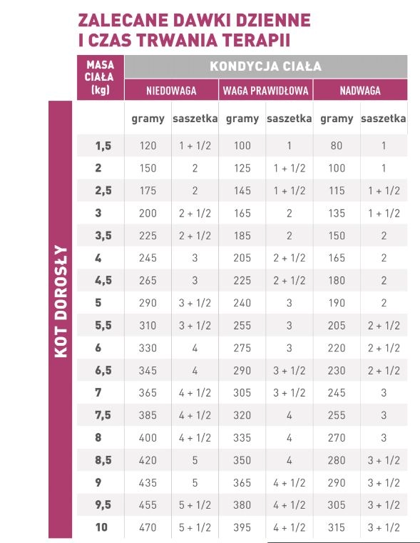 Dawkowanie: karma jest dostosowana do wagi kota, co pozwala na precyzyjne podawanie odpowiednich porcji. Przykładowo, kot ważący 4 kg powinien otrzymać około 205 g karmy dziennie.