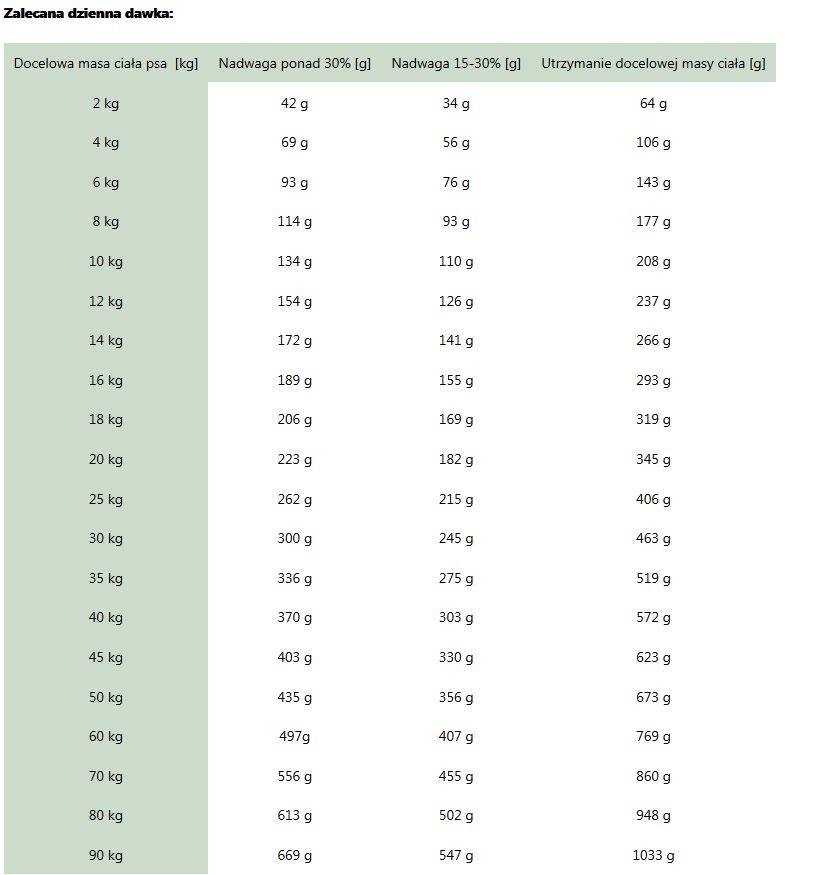 | Docelowa masa ciała psa (kg) | Początkowo | Po 4 tygodniach | Utrzymanie masy ciała |