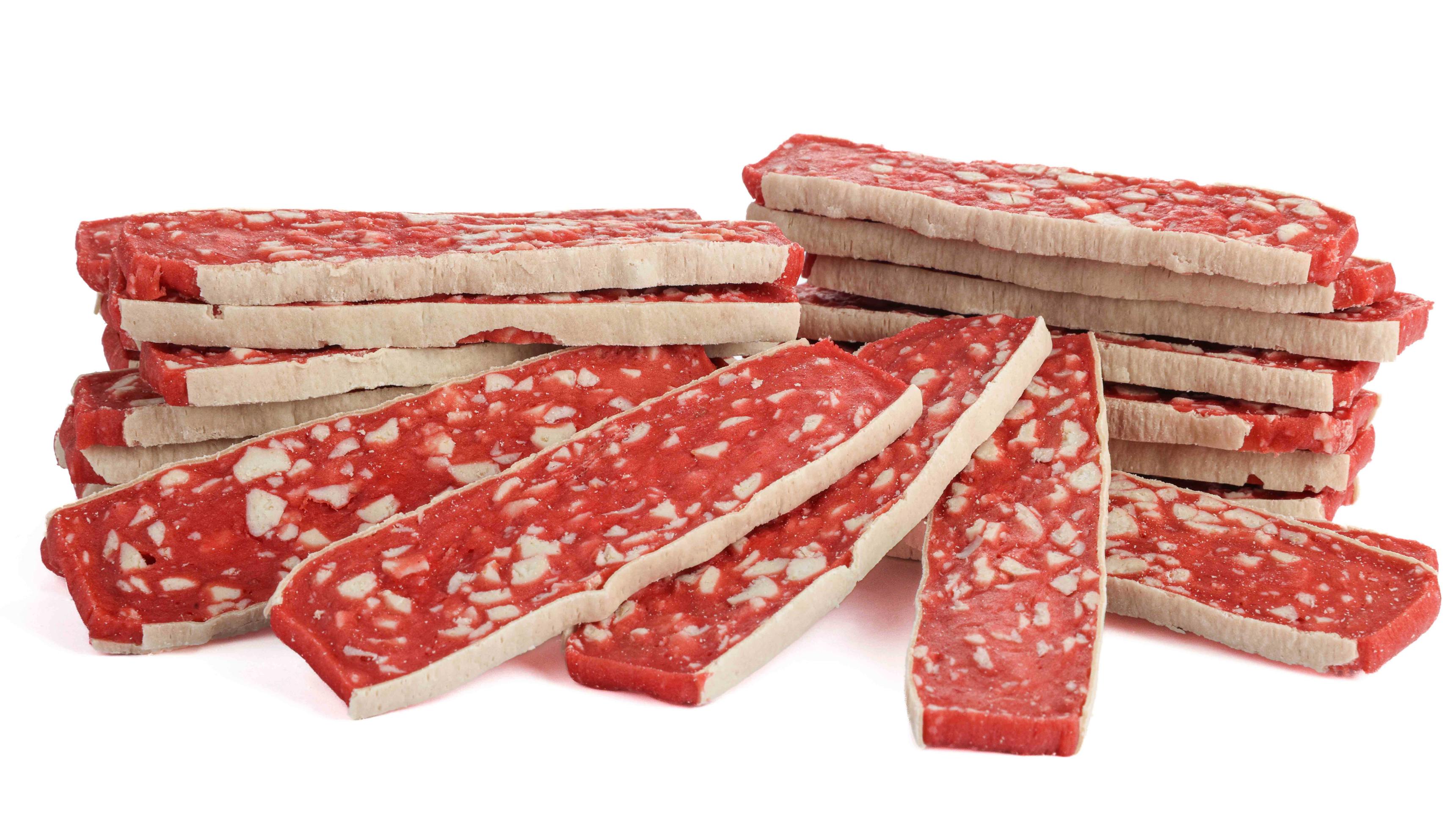Salami Sandwich jest lekkostrawny, dzięki obecności białka arachidowego i skrobi kukurydzianej, co czyni go idealną przekąską między posiłkami lub nagrodą podczas treningu. Miękka i elastyczna konsystencja sprawia, że pies chętnie po niego sięga. Czerwono-biała kolorystyka oraz kształt przypominający prawdziwe salami przyciągają uwagę i zachęcają do gryzienia.