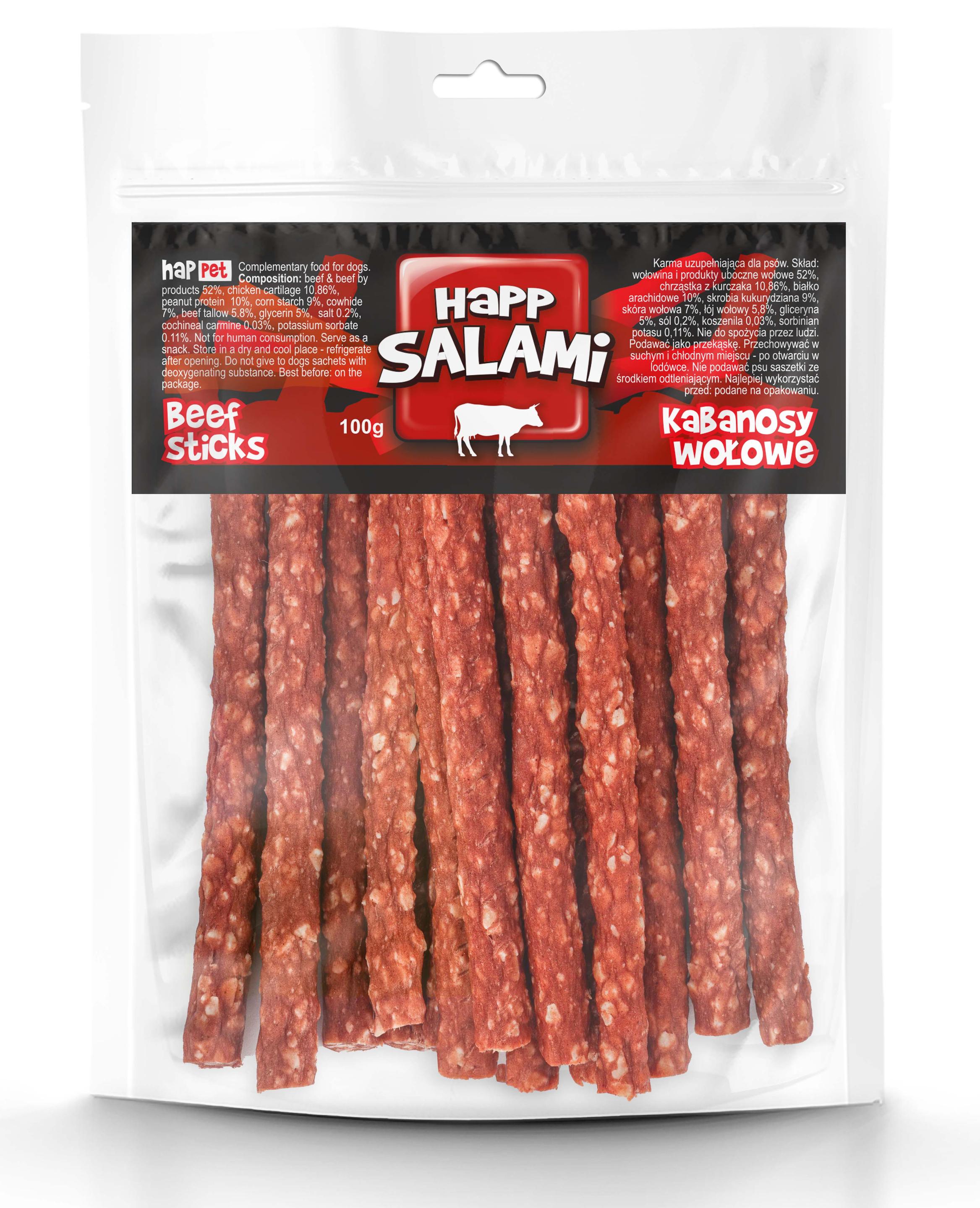 Salami wołowe pałeczki to doskonały wybór jako nagradzający smakołyk lub przekąska między posiłkami. Zaskocz swojego pupila autentycznym wyglądem prawdziwego salami!