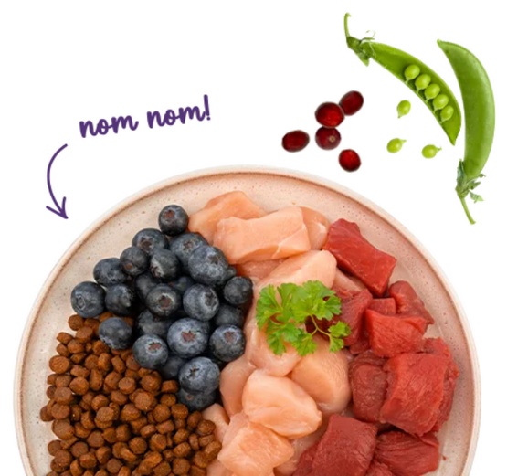 Składniki: świeże mięso z kurczaka, jęczmień, kukurydza, skwarki, tłuszcz zwierzęcy, mąka ryżowa, białko drobiowe, białko kukurydziane, białko strusia (4%), groch, hydrolizat białka, suszona pulpa buraczana, skrobia grochowa, mączka wątrobowa, węglan wapnia, olej z łososia (0.5%), chlorek potasu, borówka brusznica (0.1%), jagody (0.1%), suszona pietruszka (0.1%), drożdże (0.1%), kwiaty nagietka (0.05%).