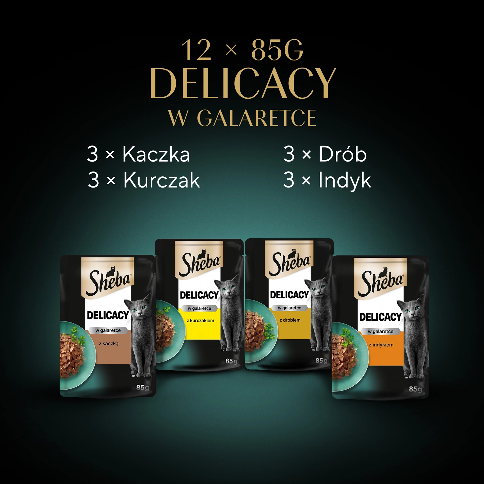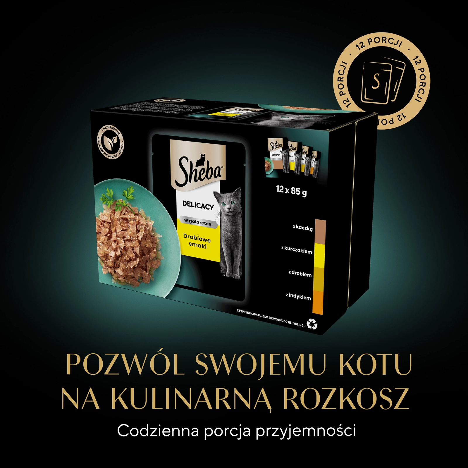 Mokra karma dla kotów Sheba Delicacy in Jelly Smaki Drobiowe to doskonały wybór dla smakoszy. Zestaw saszetek zawiera pyszne kawałki kurczaka, indyka, kaczki i drobiu, zanurzone w aromatycznym sosie. To pełnoporcjowa karma stworzona z myślą o dorosłych kotach, które potrzebują różnorodności w diecie.