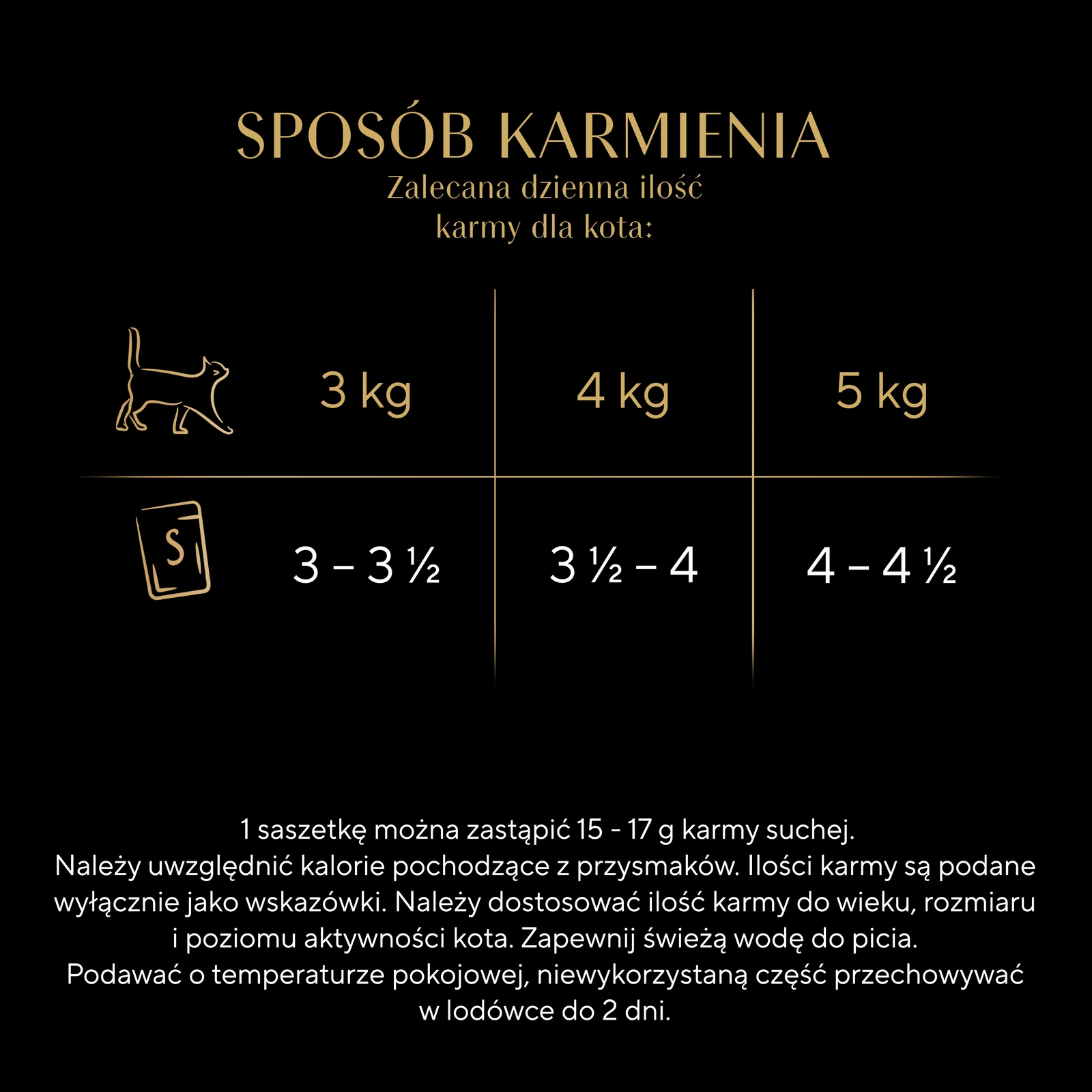 Dla kota o wadze 3 kg zaleca się 2,5 saszetki dziennie lub 1,5 saszetki mokrej i 15 g suchej. Kot o wadze 4 kg powinien otrzymywać 3 saszetki lub 2 saszetki mokrej oraz 20 g suchej. Natomiast kot o wadze 5 kg potrzebuje 3,5 saszetki mokrej lub 2,5 saszetki mokrej i 20 g suchej.