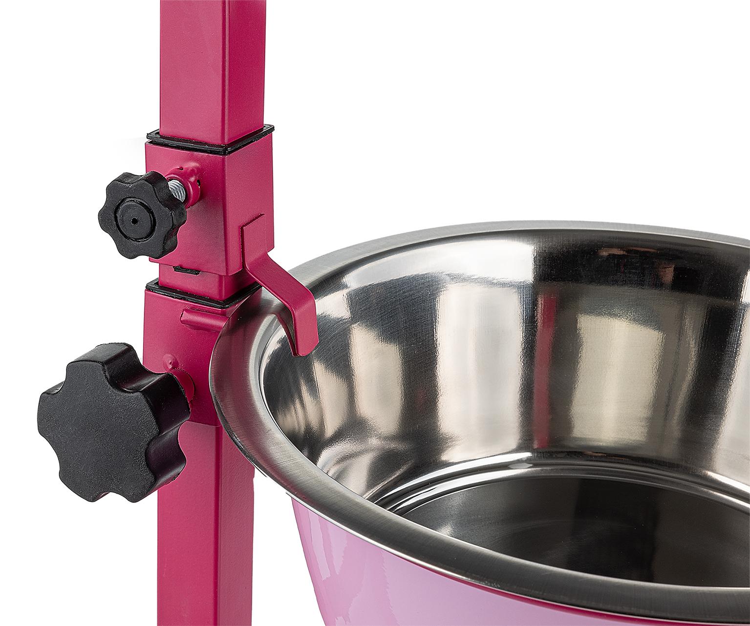 Stojak jest prostą w użyciu, stabilną konstrukcją nie wymagającą narzędzi. Miski wykonane są z łatwej w czyszczeniu stali nierdzewnej, można używać ich zarówno do podawania karmy, jak i wody.