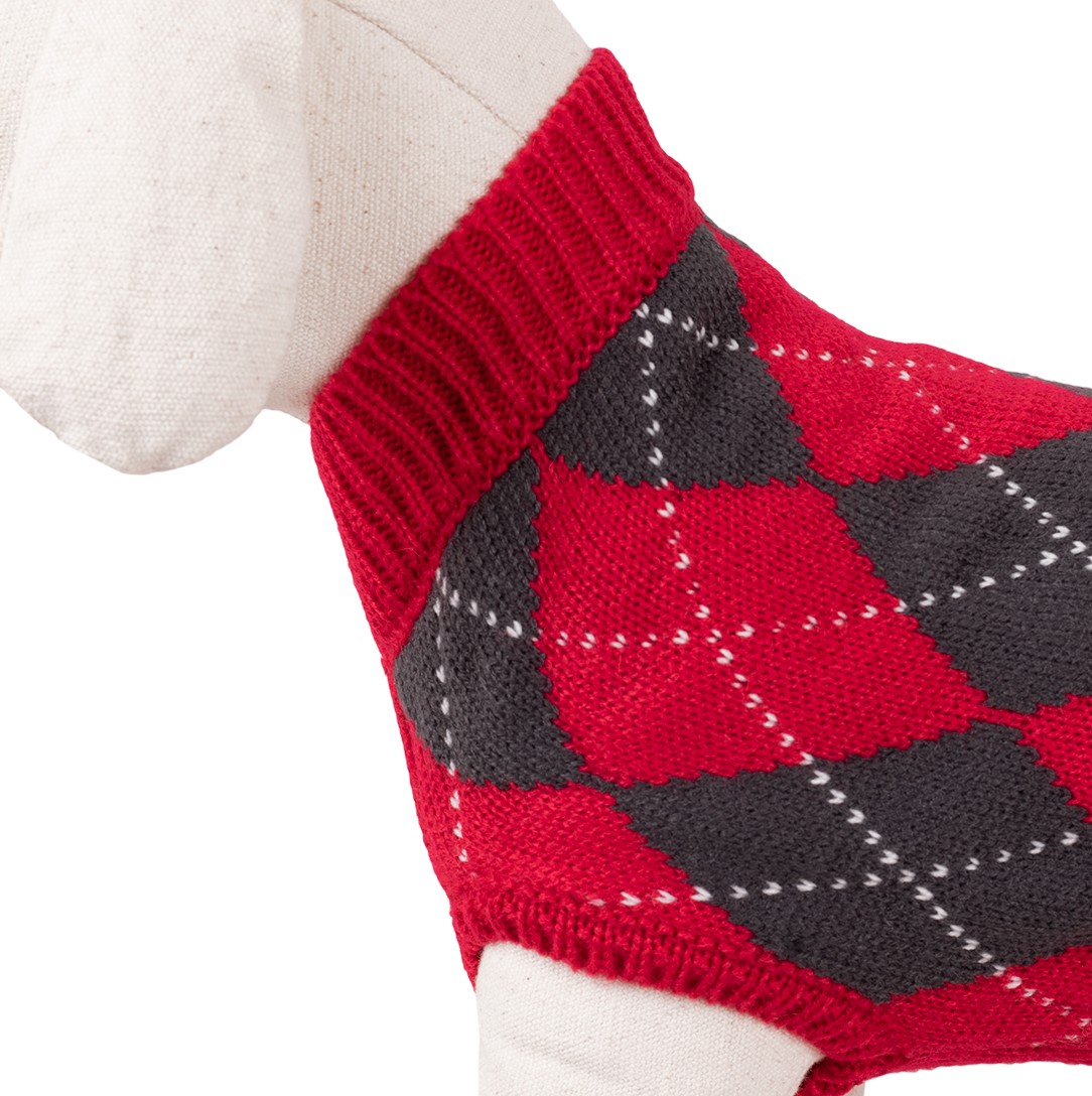 Sweterek w romby w kolorze czerwono-grafitowym to doskonały wybór dla Twojego pupila. Jest lekki, ciepły i wygodny, co sprawia, że świetnie sprawdzi się w chłodne dni. Miękki materiał, z którego jest wykonany, zapewnia komfort noszenia. Sweterek zakłada się przez głowę, a ściągacz przy szyi pozwala na idealne dopasowanie.