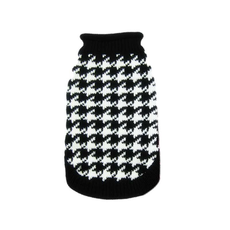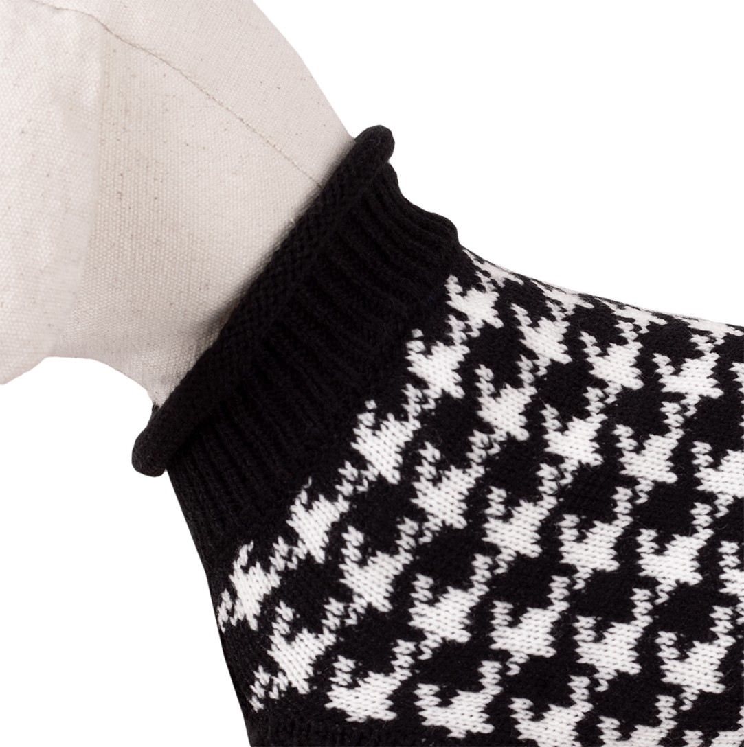 Stylowy, czarno-biały sweterek dla psa, idealny na chłodne dni. Wykonany z miękkiego akrylu, zapewnia komfort i ciepło. Dzięki modnemu wzorowi w pepitkę, Twój pupil będzie wyglądał wyjątkowo.