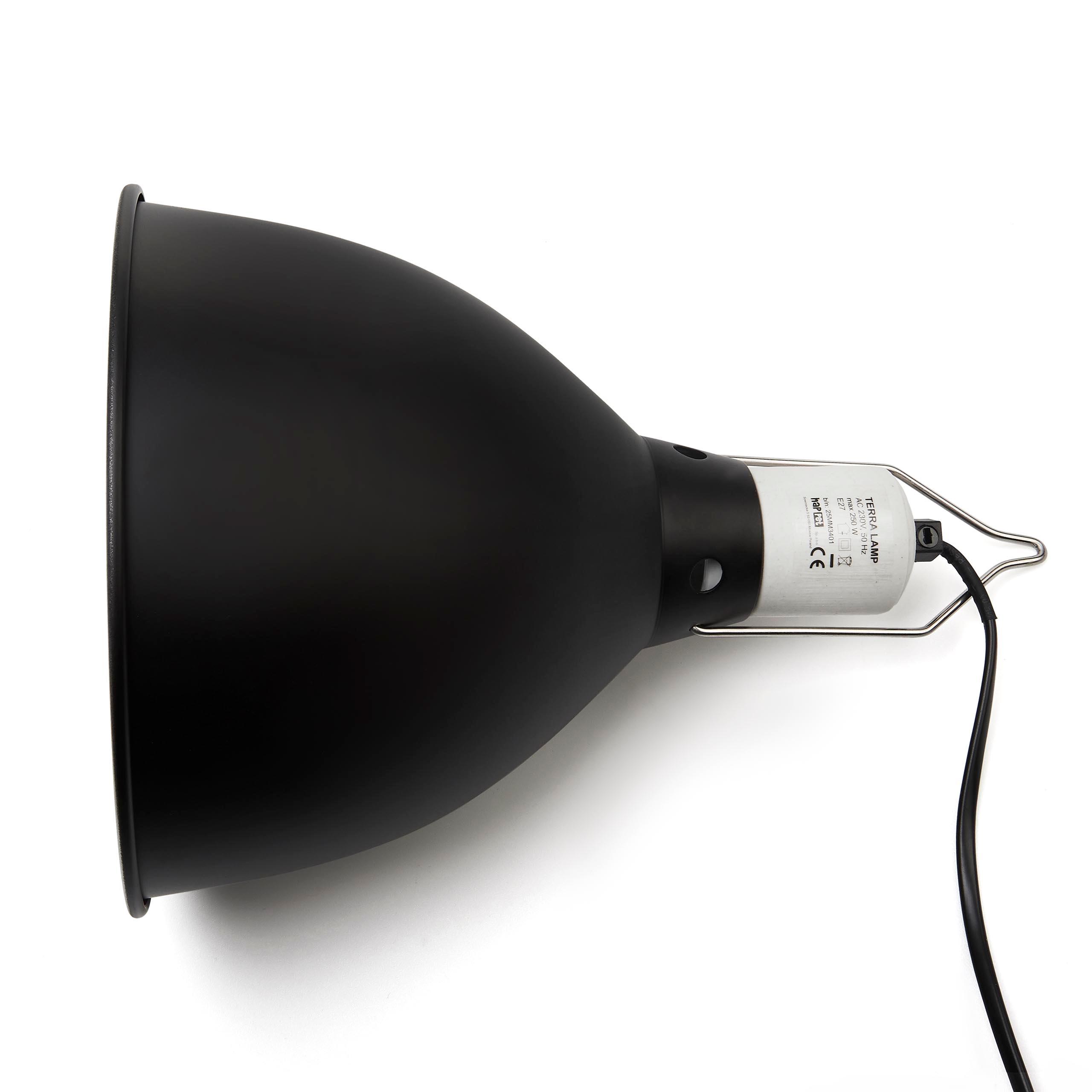 Klosz z odbłyśnikiem do żarówki 20cm z oprawą ceramiczną, klamrą i siatką ochronną Niezbędny element wyposażenia każdego profesjonalnego terrarium, łączący wysoką estetykę (nowoczesny, matowy design) z bezkompromisowym bezpieczeństwem dla hodowanych zwierząt. Ta funkcjonalna oprawa została zaprojektowana w celu ochrony podopiecznych oraz optymalizacji warunków cieplnych i oświetleniowych w zbiorniku. Solidna, metalowa siatka ochronna stanowi barierę, całkowicie osłaniając źródło ciepła. Skutecznie uniemożliwia zwierzętom (szczególnie wężom lub innym nadrzewnym gadom) bezpośredni kontakt z gorącą żarówką, całkowicie eliminując ryzyko poparzeń. Wnętrze klosza zostało wykończone na wysoki połysk (polerowany odbłyśnik), dzięki czemu działa jak reflektor. Taka konstrukcja maksymalizuje wydajność żarówki, precyzyjnie odbijając i skupiając promieniowanie (zarówno światło widzialne, jak i ciepło) w dół, do wnętrza terrarium, zapobiegając stratom energii. Sercem oprawy jest wysokotemperaturowa oprawa ceramiczna, gwarantująca trwałość i pełne bezpieczeństwo użytkowania. Jest ona kompatybilna ze wszystkimi standardowymi żarówkami grzewczymi i oświetleniowymi (gwint E27). Dołączona do zestawu solidna klamra montażowa (klips) pozwala na szybką, stabilną i uniwersalną instalację na krawędzi zbiornika. Kluczowe Cechy Produktu: Nowoczesnym design: Matowe wykończenie, pasujące do każdej aranżacji. Bezpieczeństwo: Zintegrowana siatka ochronna gwarantująca bezpieczeństwo gadów, płazów oraz innych zwierząt. Obudowa z otworami, odprowadzającymi nadmiar ciepła. Ergonomia: Polerowany reflektor dla maksymalizacji efektywności promieniowania. Trwałość: Wysokiej jakości, wysokotemperaturowa oprawa ceramiczna na standardowy gwint E27. Prosty montaż: Solidny klips montażowy umożliwiający elastyczną i stabilną instalację. Średnica: 20 cm Maksymalna moc: 250 W Napięcie: 230 V Długość przewodu: 180 cm