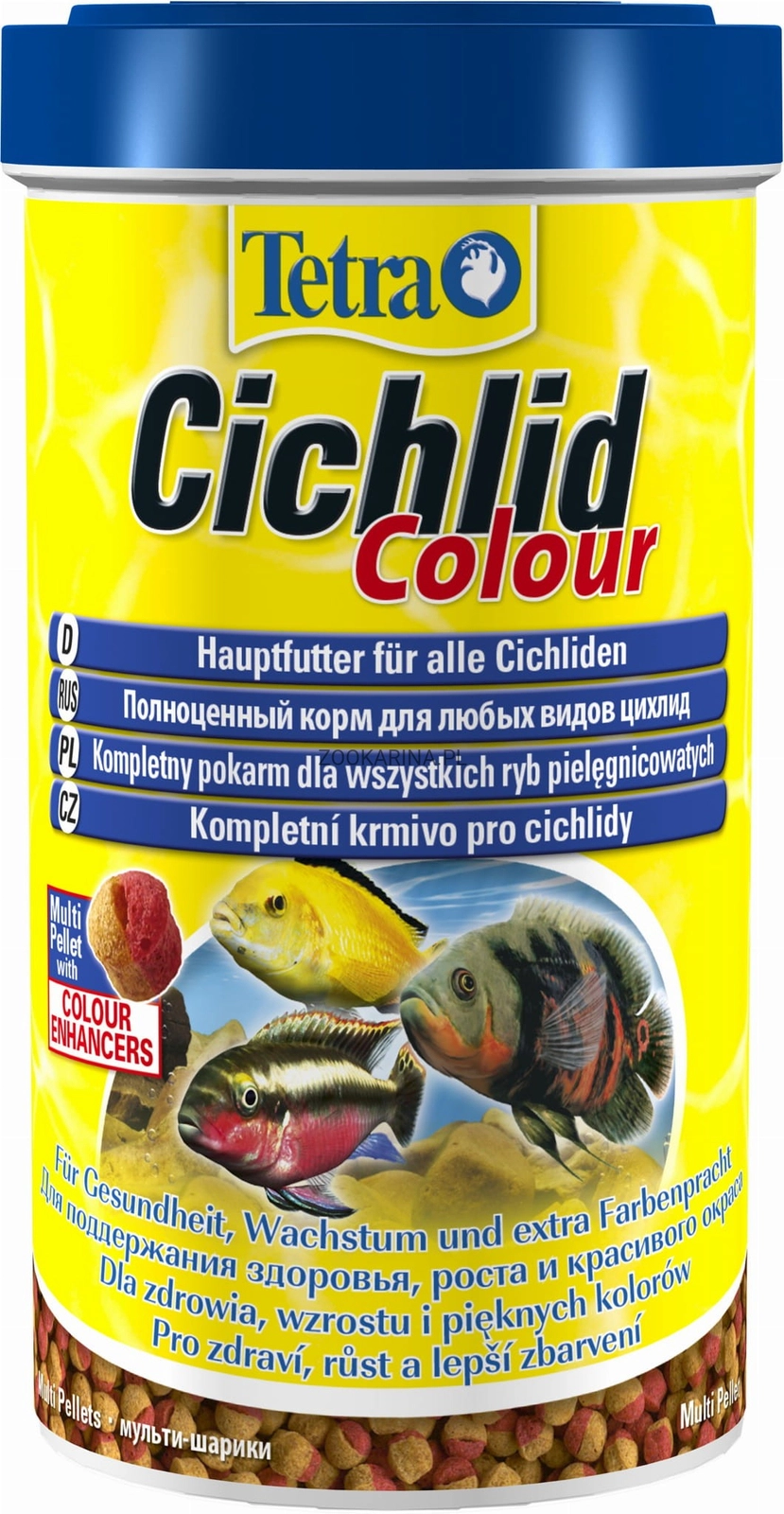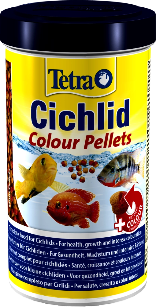 Tetra Cichlid Colour Pellets to kompletny, wybarwiający pokarm dla pielęgnic dostępny w dwóch granulacjach. Duża zawartość białek wspiera rozwój a formuła Multi Pellet bogata w naturalne substancje wzmacniające koloryt intensyfikuje wybarwienie żółtych, pomarańczowych i czerwonych ryb tropikalnych.