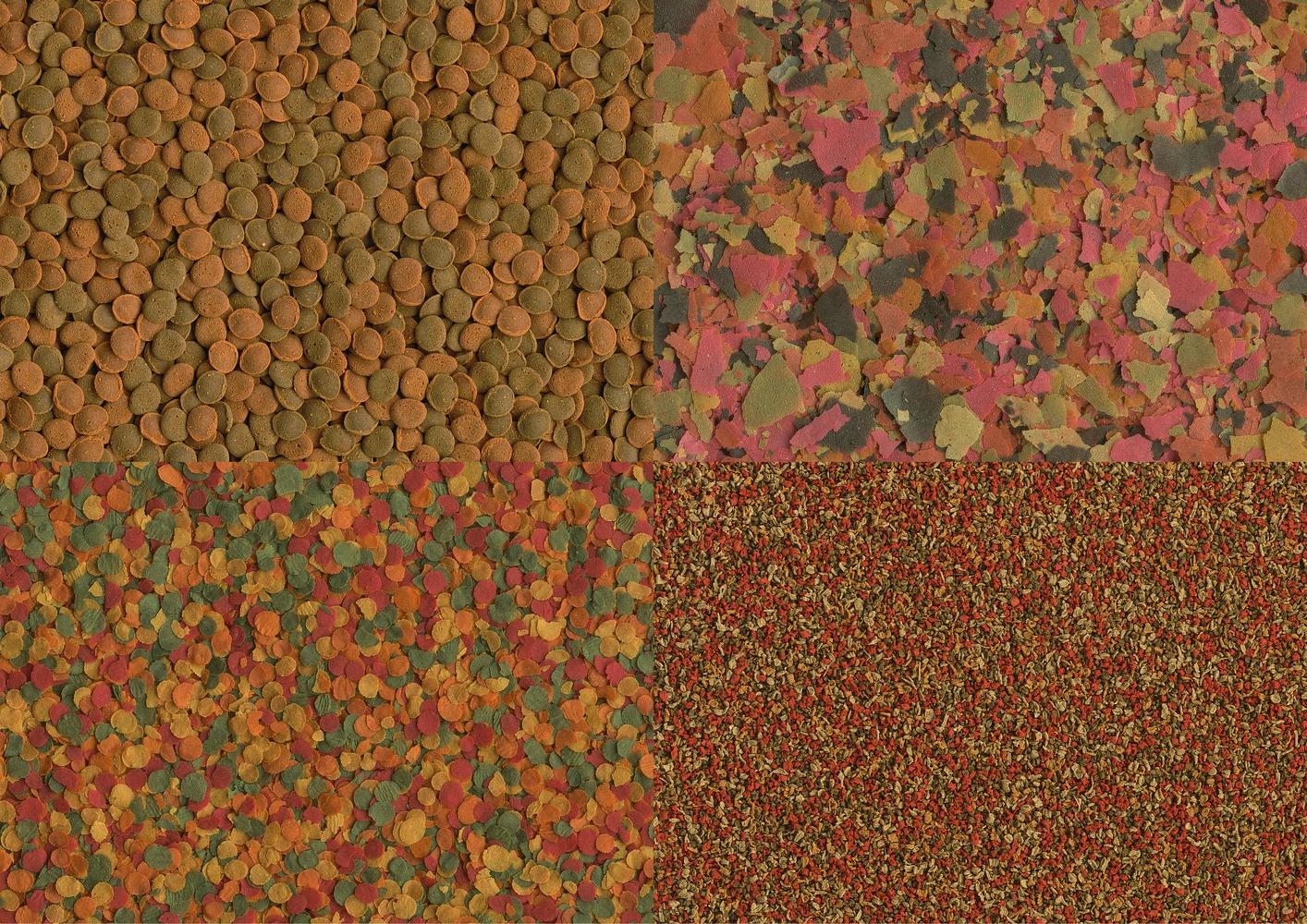 4 rodzaje pokarmów podstawowych w 4 przegrodach dla ryb żyjących we wszystkich strefach akwarium.
