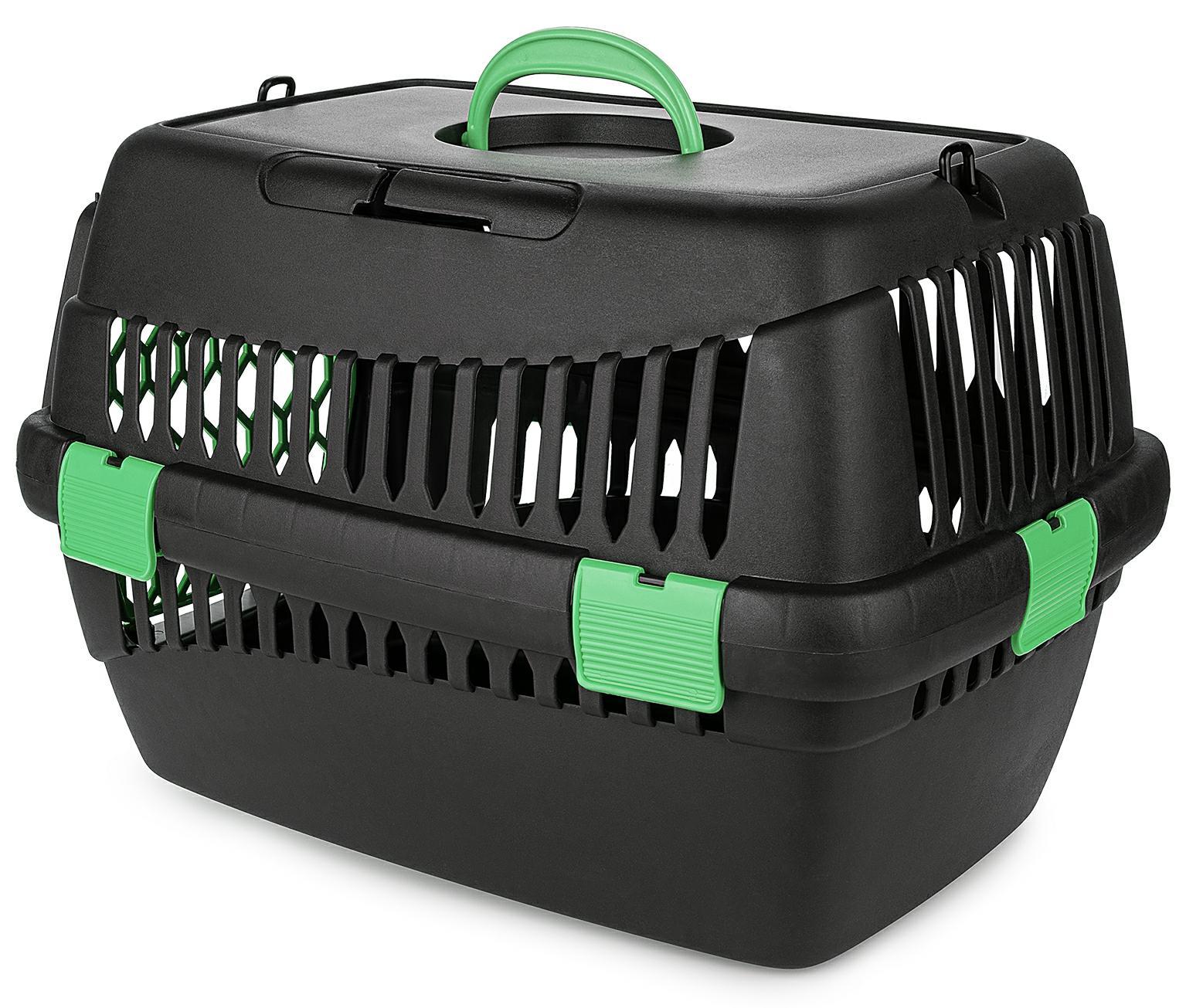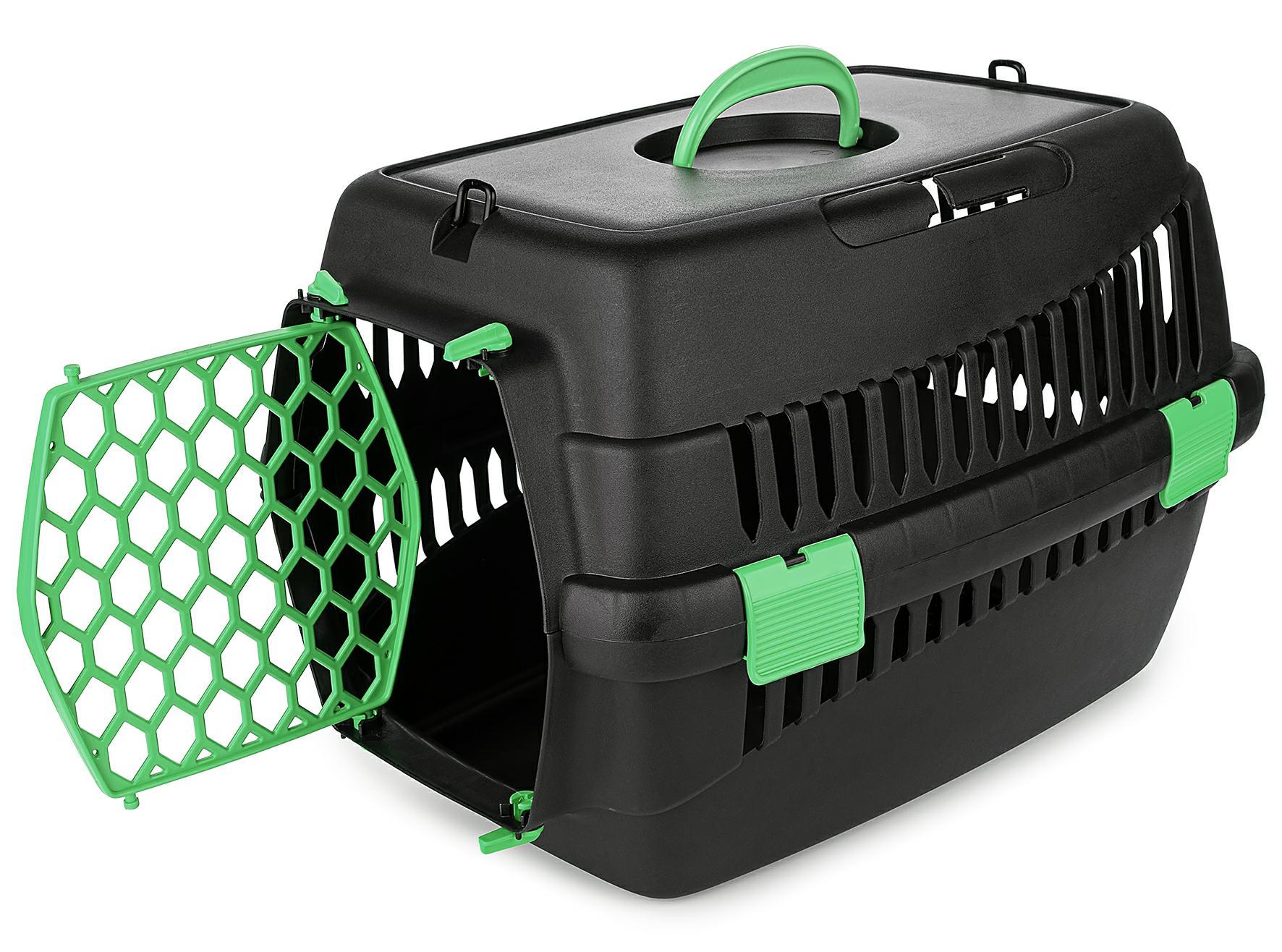 Transporter można bezpiecznie przypiąć w samochodzie pasami lub trzymać na kolanach. Wygodna rączka oraz możliwość zamocowania paska na ramię ułatwiają przenoszenie. Wewnątrz jest wystarczająco dużo przestrzeni, a wentylacyjne otwory oraz krata zapewniają odpowiednią cyrkulację powietrza, co minimalizuje stres u zwierzaka.