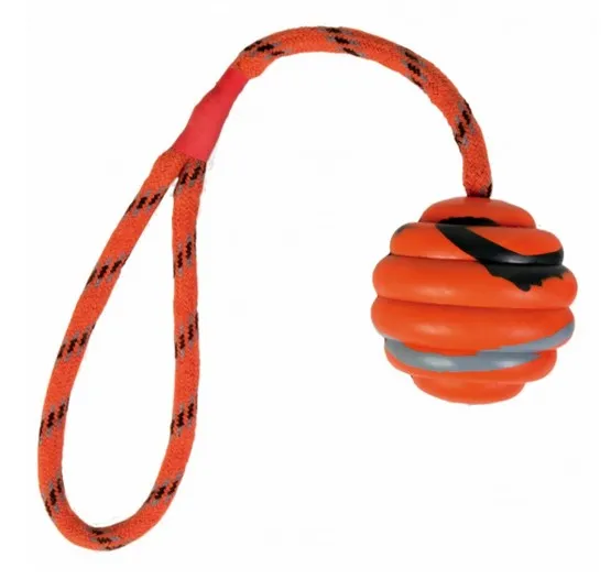 Oferujemy piłkę kauczukową z przymocowanym sznurem, idealną do zabawy z Twoim pupilem.