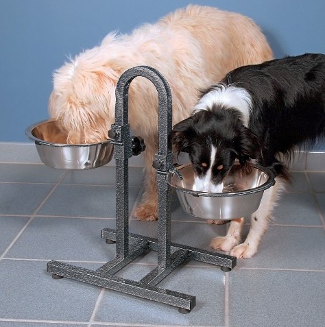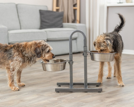 Stojak wyposażony jest w dwie miski ze stali nierdzewnej o pojemności 2,8 L i średnicy 24 cm, co zapewnia wystarczającą ilość miejsca na jedzenie lub wodę. Dodatkowo, antypopoślizgowe stopki gwarantują stabilność podczas korzystania. To praktyczne i funkcjonalne akcesorium, które zadba o wygodę Twojego psa.