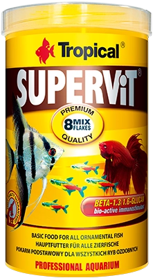 Płatki Supervit to uniwersalny pokarm przeznaczony do codziennego karmienia większości gatunków ryb wszystkożernych.