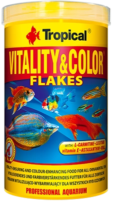 Obecna w pokarmie naturalna astaksantyna intensyfikuje barwy ryb oraz wpływa korzystnie na przebieg wielu procesów fizjologicznych, w tym rozmnażanie oraz ochronę komórek przed szkodliwym działaniem wolnych rodników. Aby ryby mogły lepiej wykorzystać zawarte w pokarmie tłuszcze, pokarm Vitality & Color został wzbogacony o L-karnitynę, która wspomaga metabolizm tłuszczów. Regularne stosowanie Vitality & Color sprawia, że ryby równomiernie rosną, dojrzewają i chętnie przystępują do tarła.