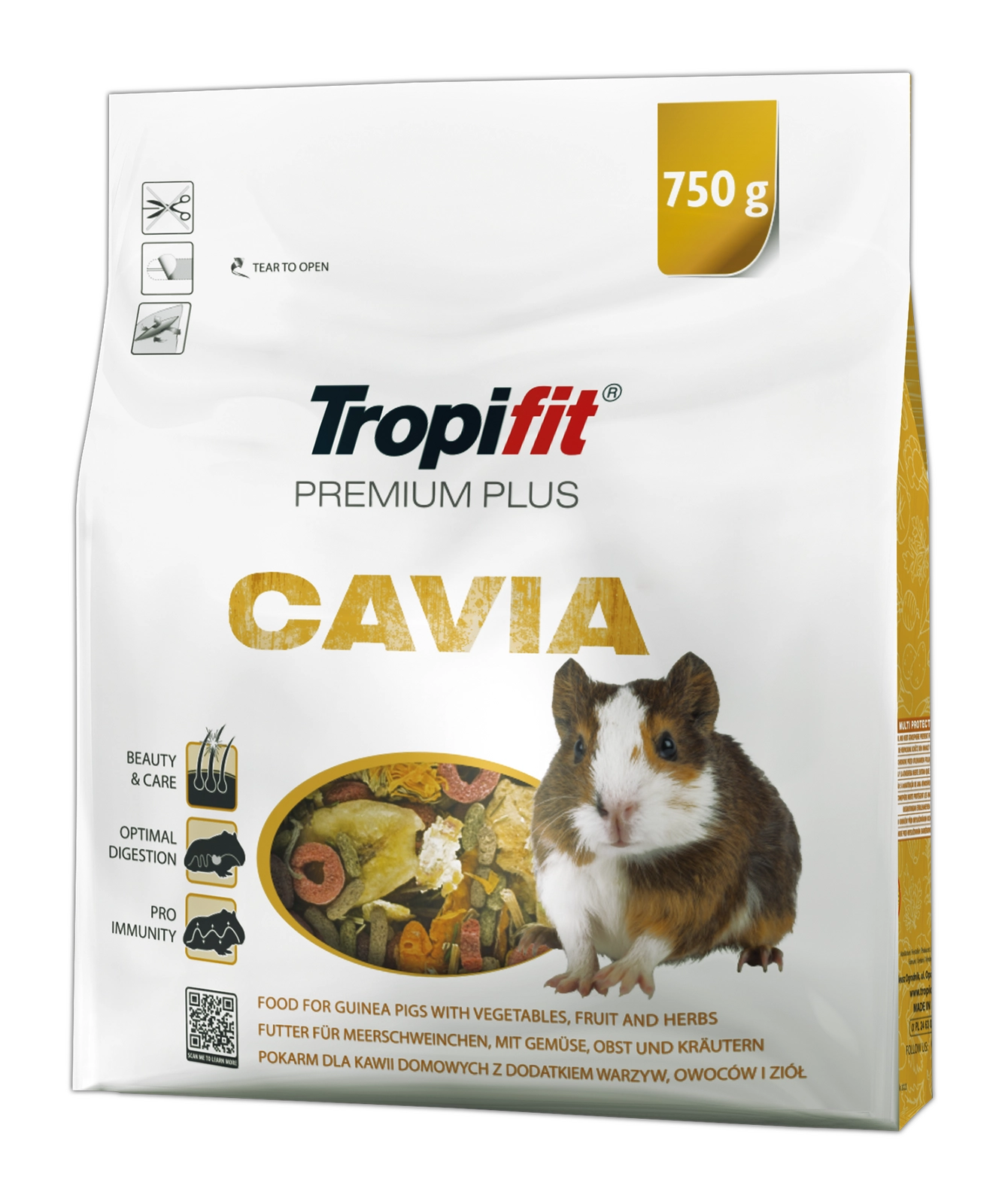 Tropifit Premium Plus Cavia nie zawiera GMO, konserwantów, wzmacniaczy smaku ani dodatku cukru. Dzięki właściwościom prebiotycznym wspiera prawidłową florę bakteryjną jelit oraz układ odpornościowy Twojego zwierzaka.