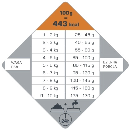 Dawkowanie: Dostosuj ilość karmy do wagi psa. Na przykład, dla psa ważącego 1-2 kg, dawka wynosi 25-45 g.