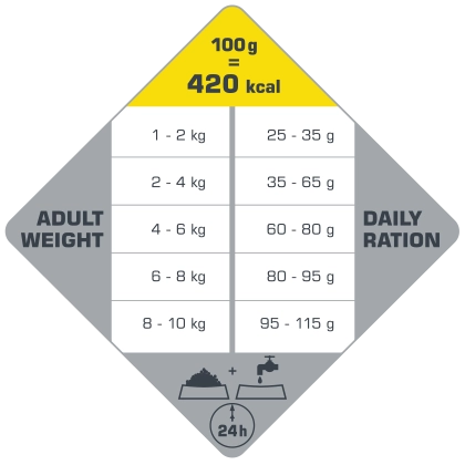 Dawkowanie: Dla psów o wadze od 1 do 2 kg - 25-35 g, 2-4 kg - 35-65 g, 4-6 kg - 60-80 g, 6-8 kg - 80-95 g, 8-10 kg - 95-115 g dziennie.