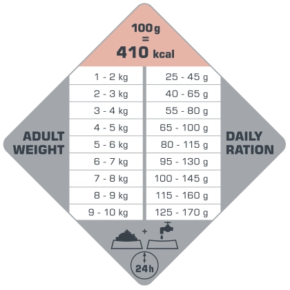 W składzie znajduje się 75% białek pochodzenia zwierzęcego, co zapewnia wysoką jakość składników odżywczych. Karma jest bezglutenowa, co zminimalizuje ryzyko nietolerancji pokarmowych. Granulki o średnicy 9 mm są dostosowane do małych psów, co ułatwia ich pobieranie.