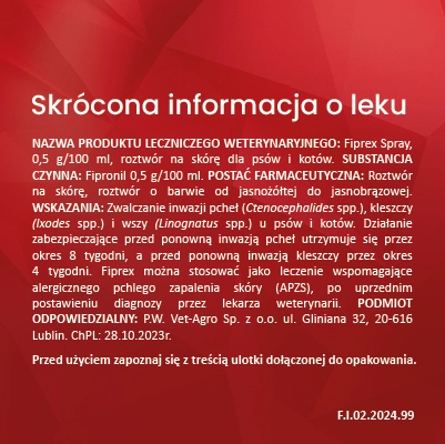 Dzięki zastosowaniu tego środka, zabezpieczenie przed ponowną inwazją pcheł utrzymuje się przez 8 tygodni, a kleszczy przez 4 tygodnie. Fiprex Spray może być również stosowany jako wsparcie w leczeniu alergicznego pchlego zapalenia skóry.